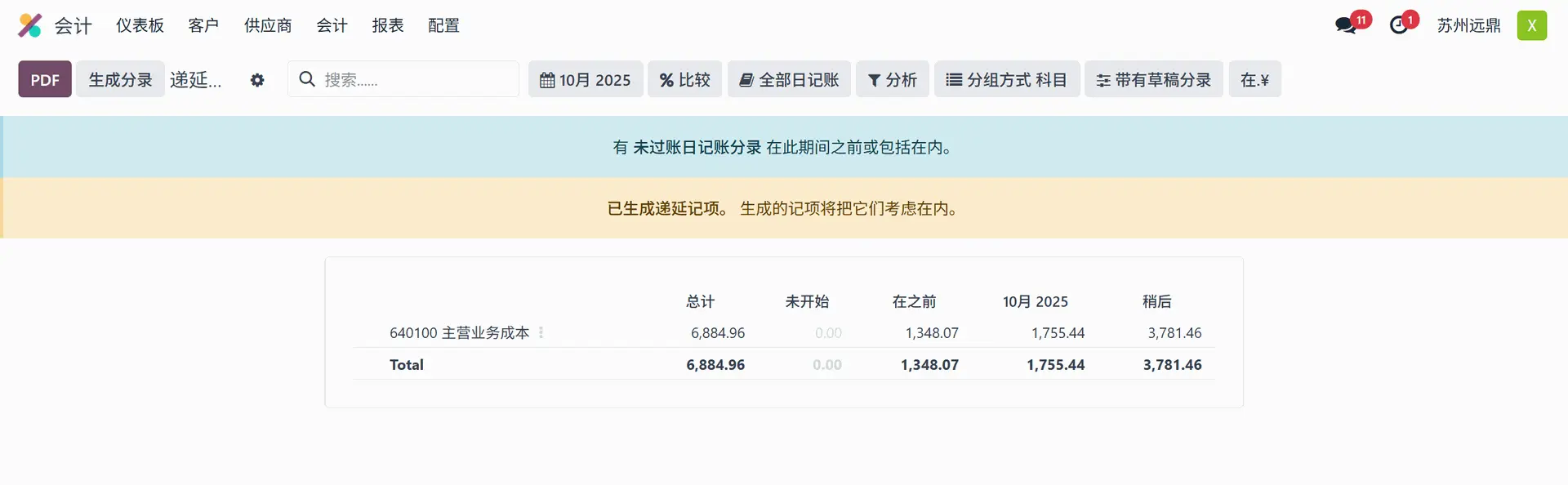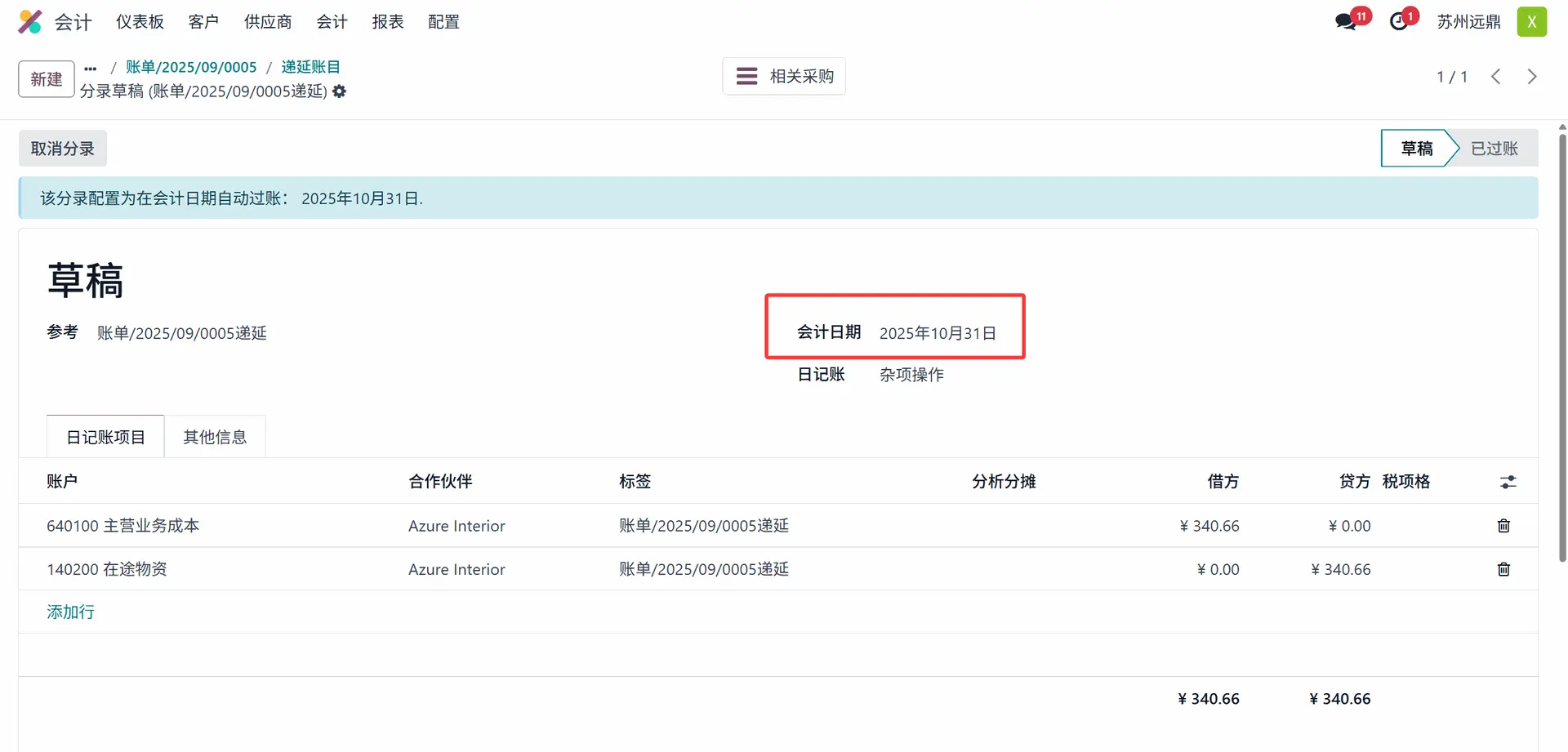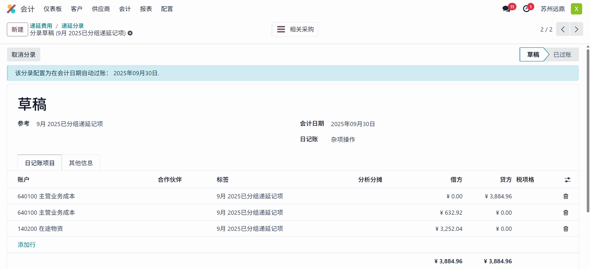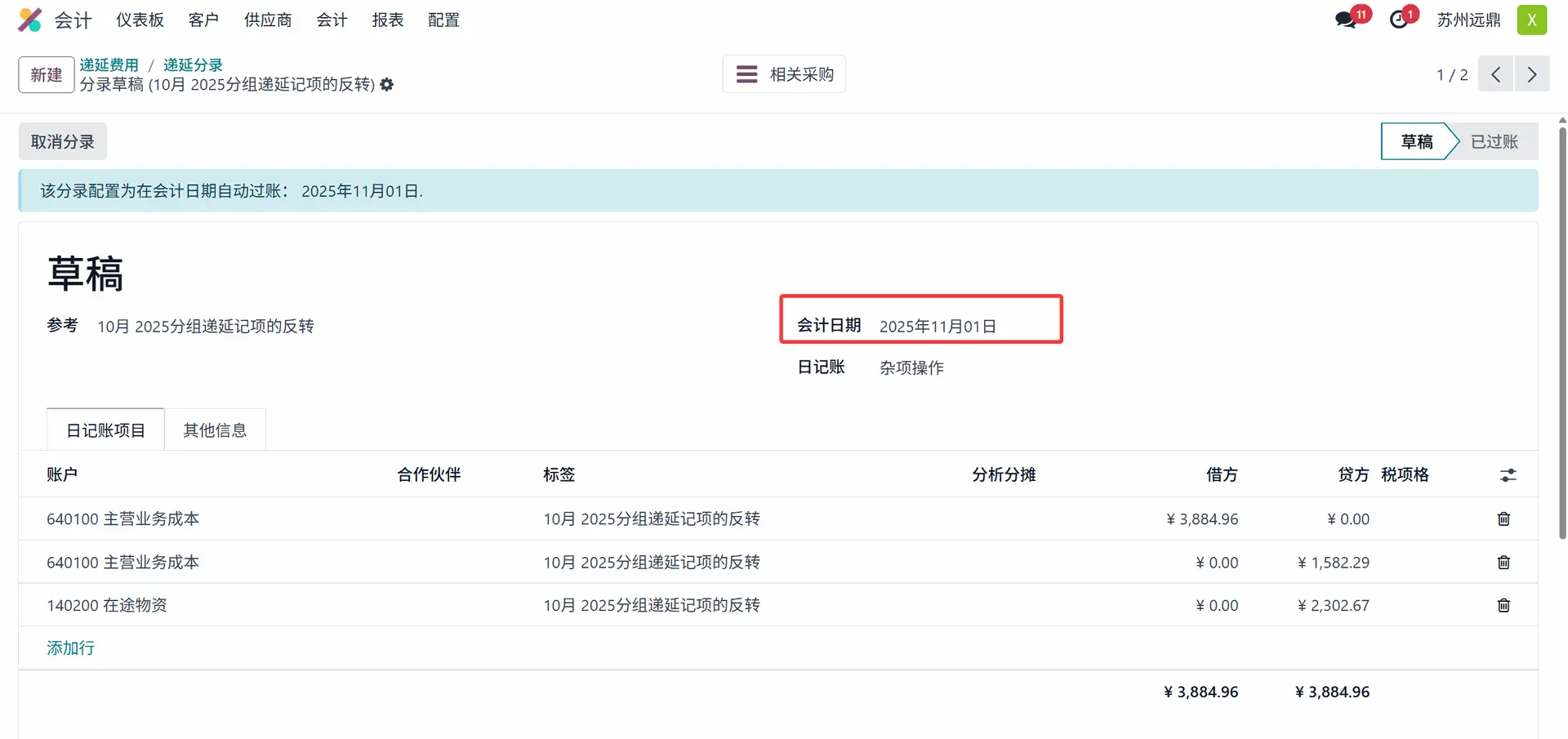 • 确认后账单进入已过账阶段,将出现递延账目智能标签页,点击可查看已创建的递延费用条目。