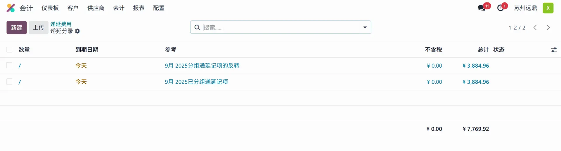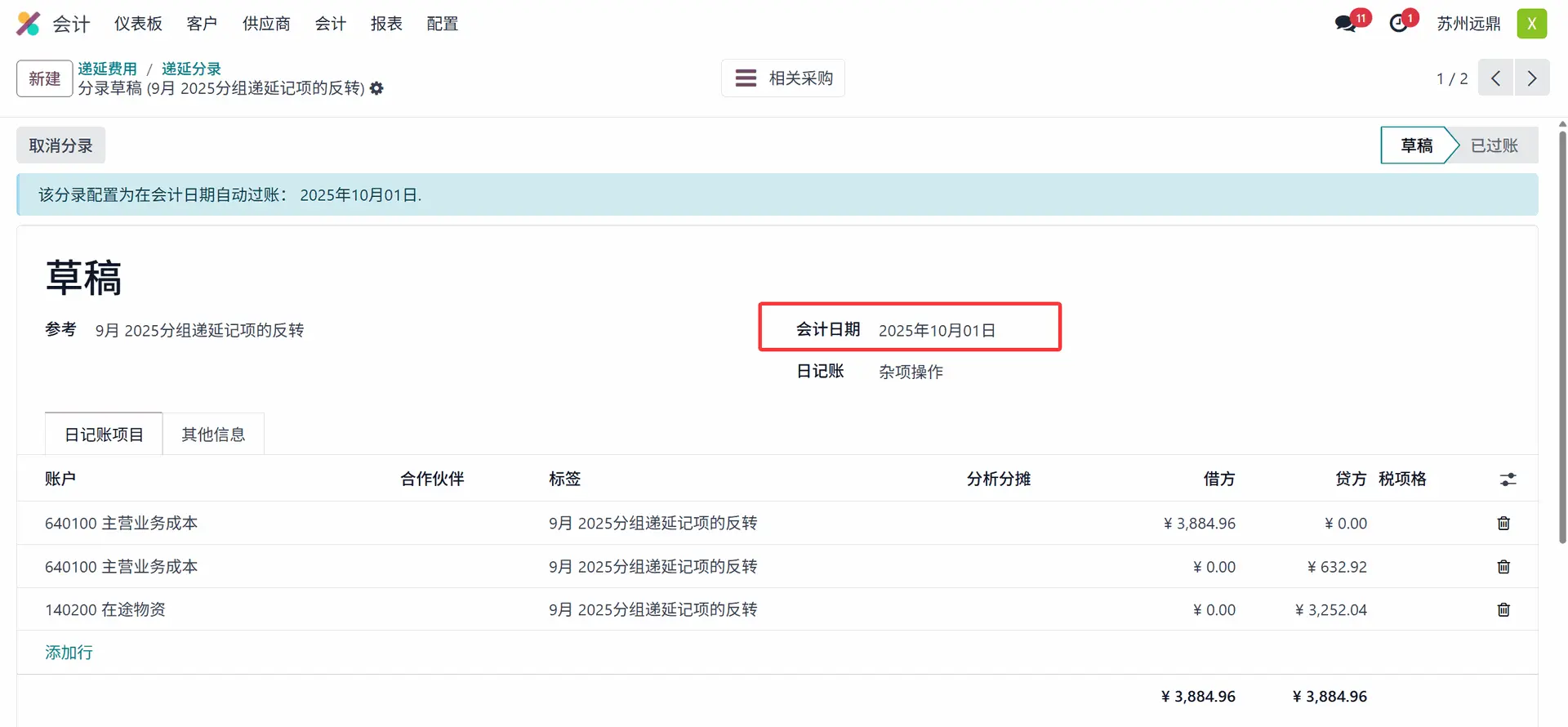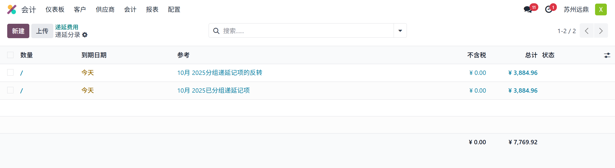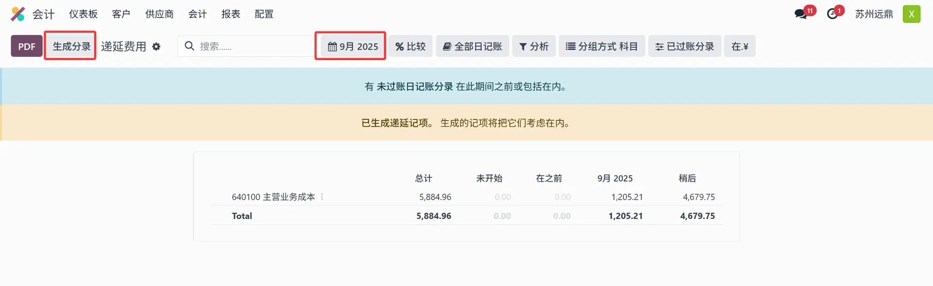 • 确认后账单进入已过账阶段,将出现递延账目智能标签页,点击可查看已创建的递延费用条目。