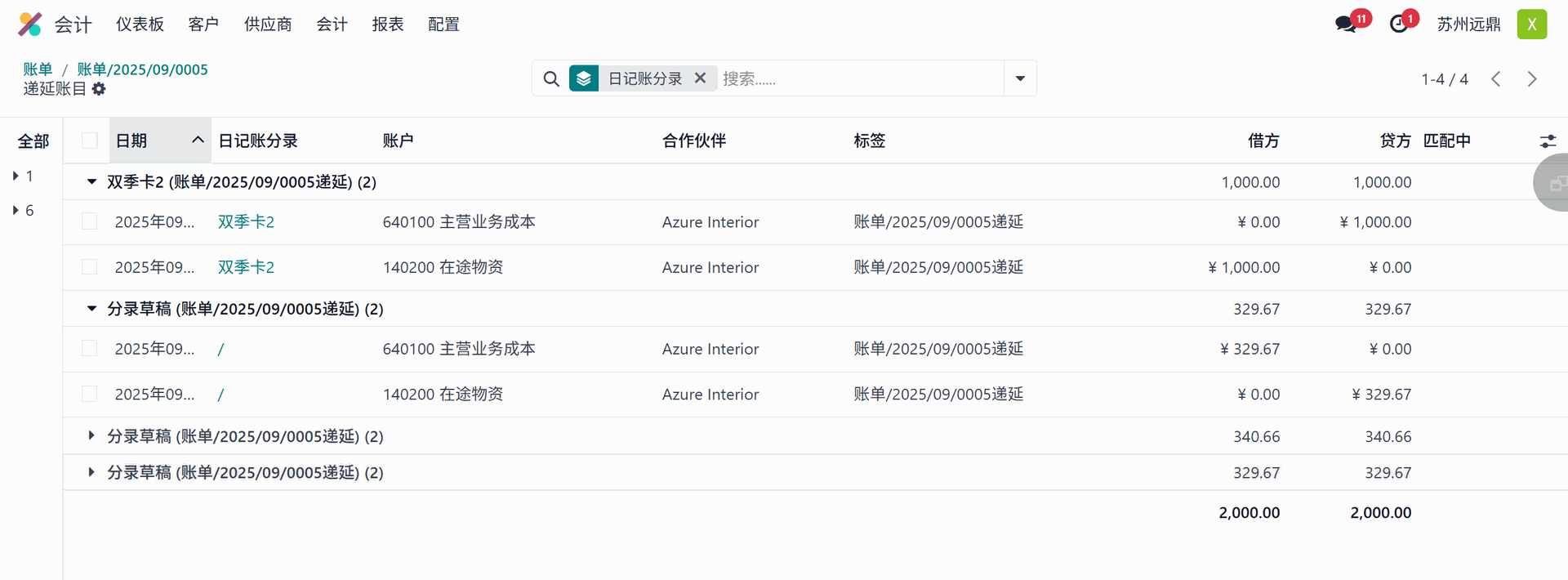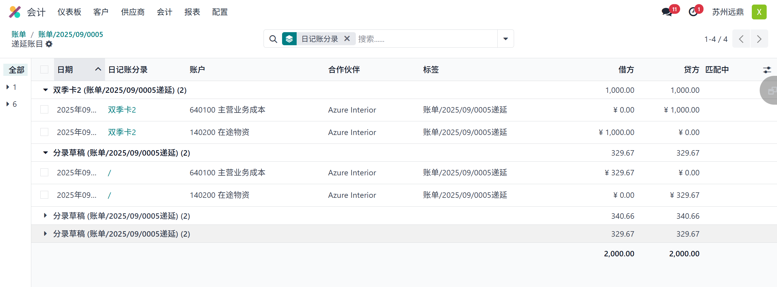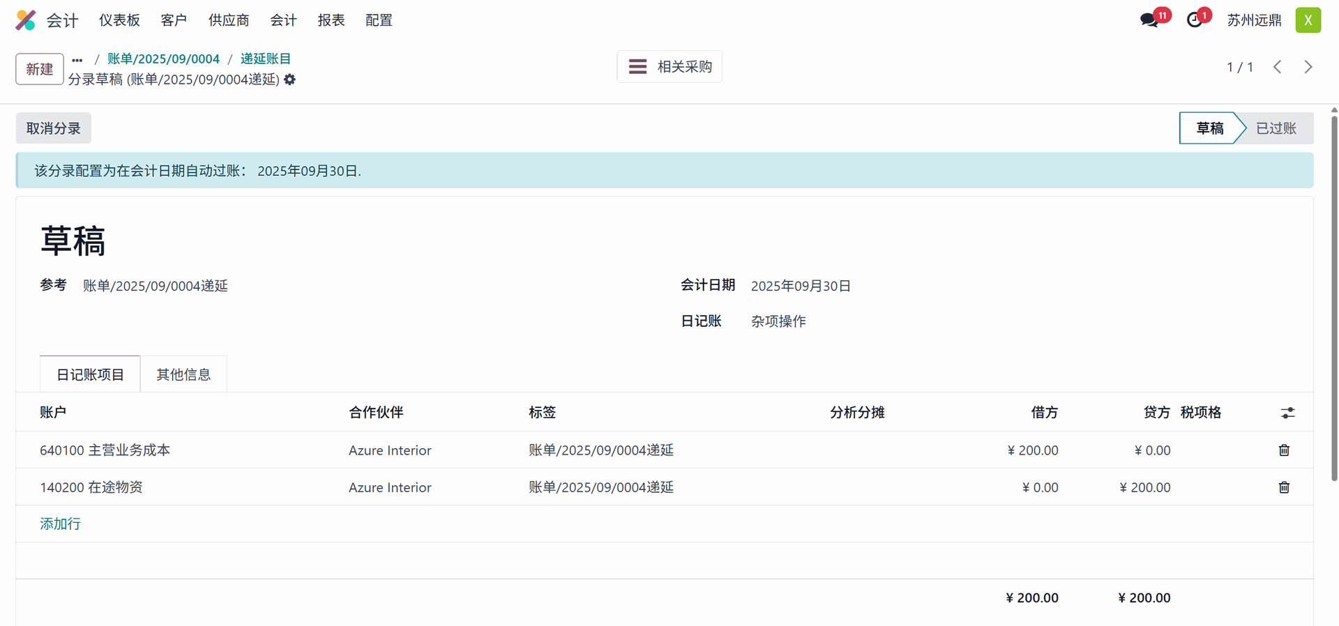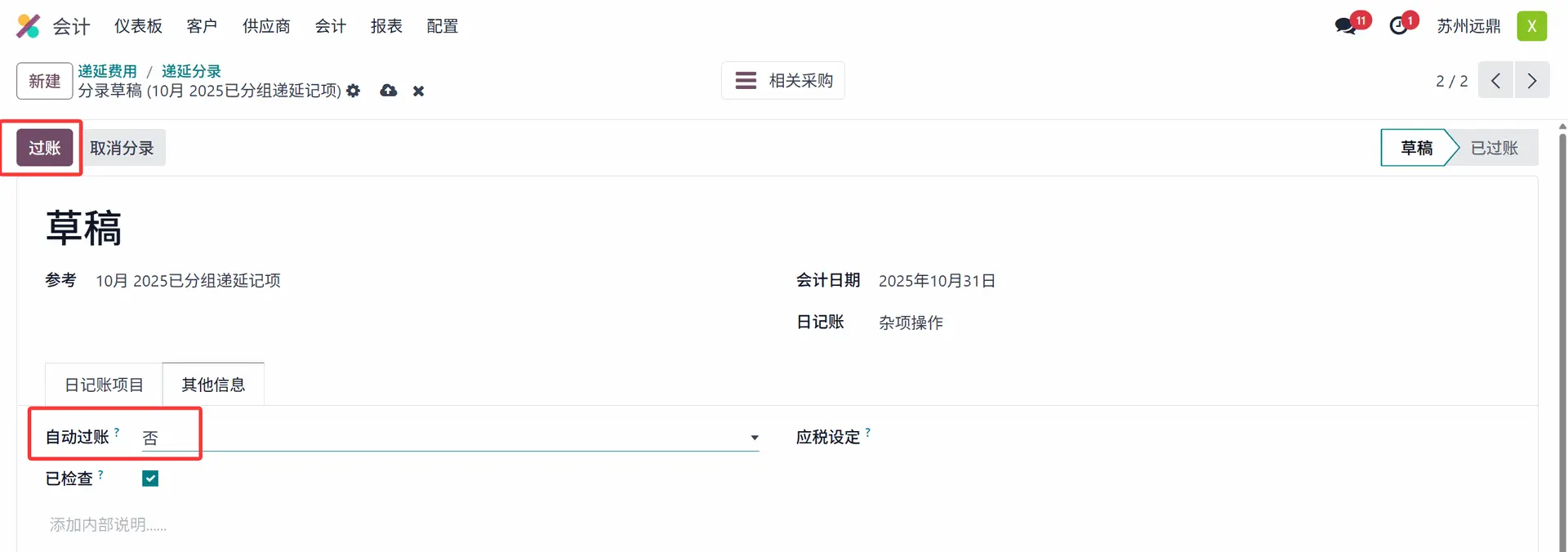 • 确认后账单进入已过账阶段,将出现递延账目智能标签页,点击可查看已创建的递延费用条目。