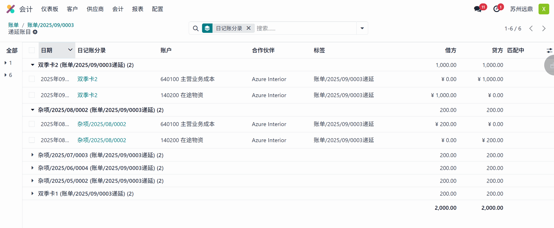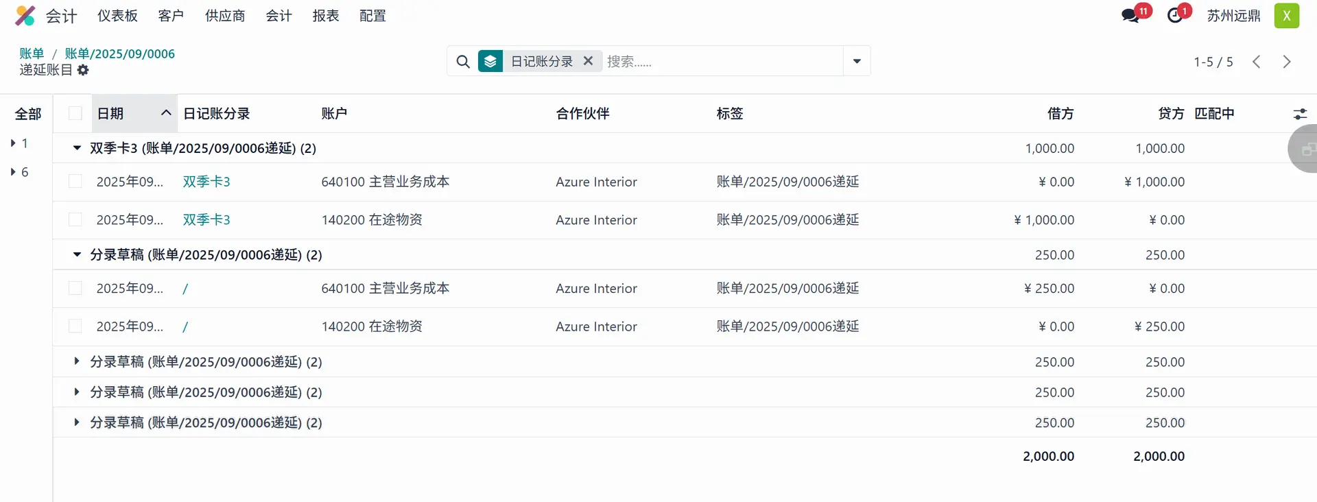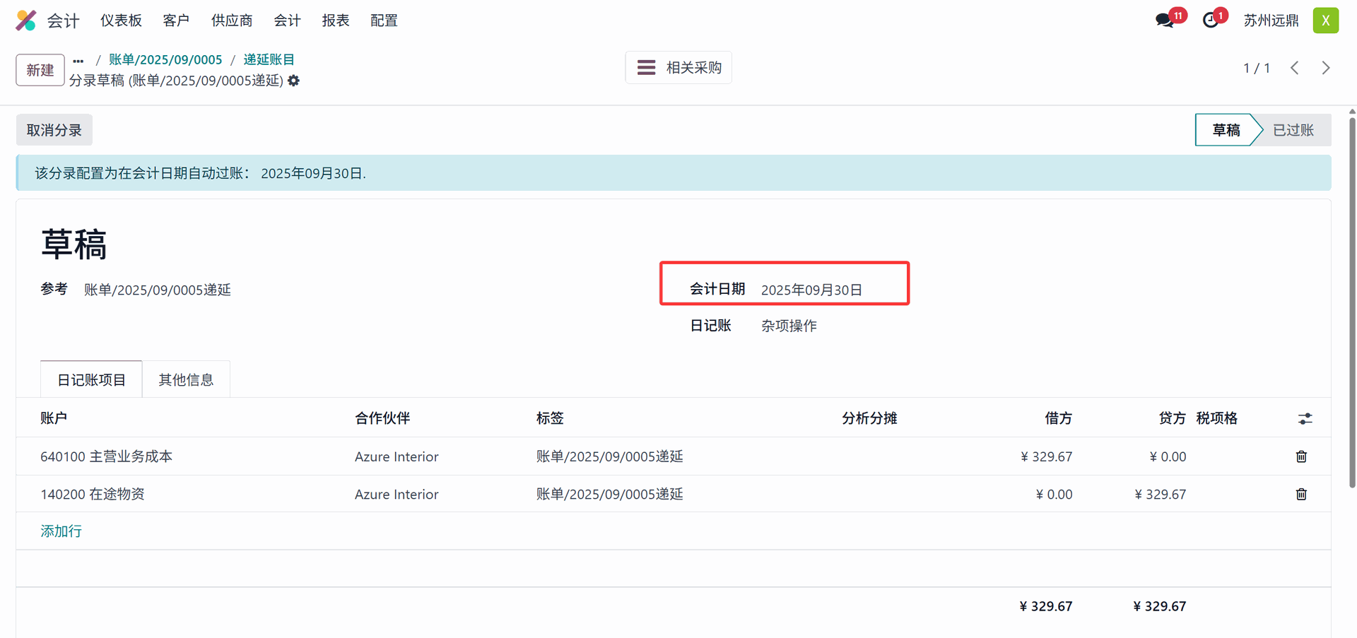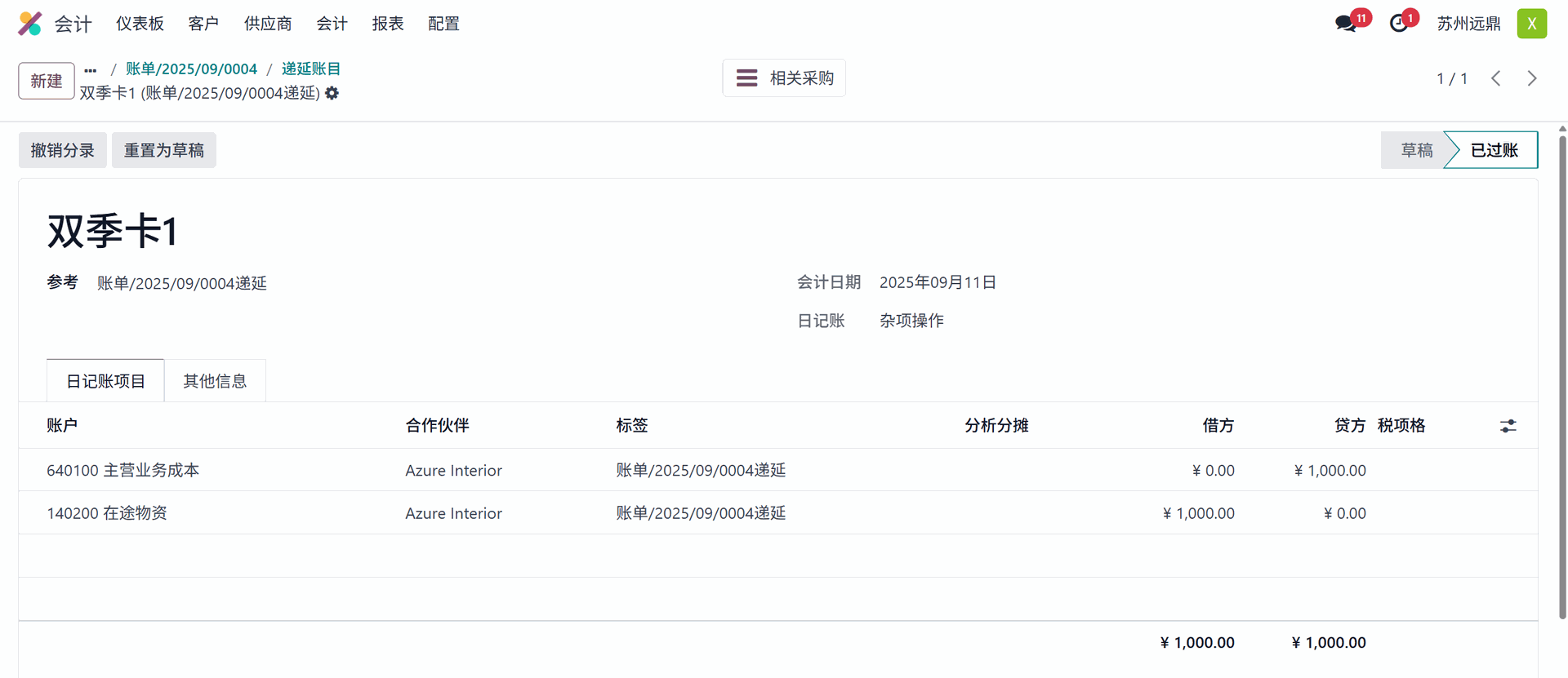• 确认后账单进入已过账阶段,将出现递延账目智能标签页,点击可查看已创建的递延费用条目。
