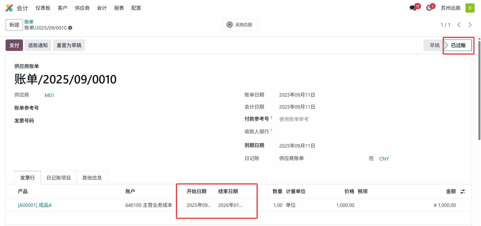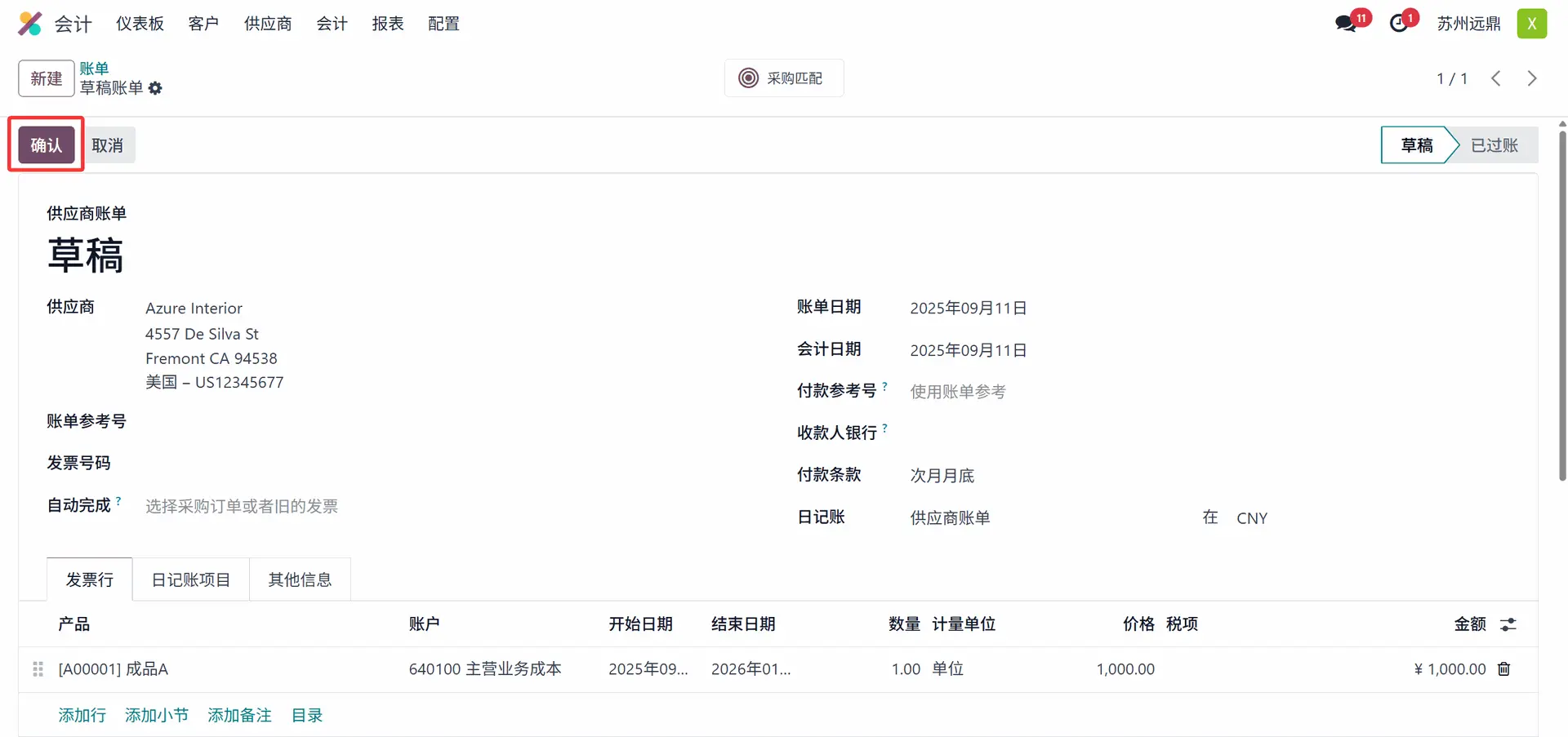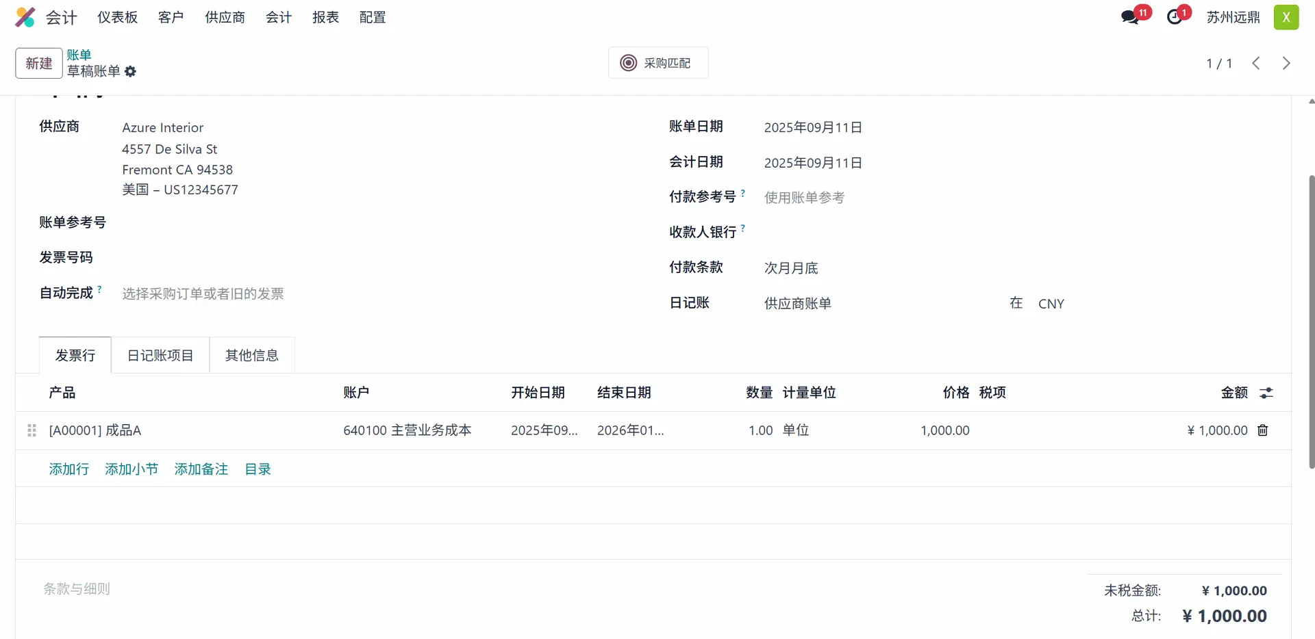 • 添加供应商、产品(成品A,1000人民币)、开始日期2025年9月11日、结束日期2025年12月31日,确认账单(此时不会自动生成日记账分录)。