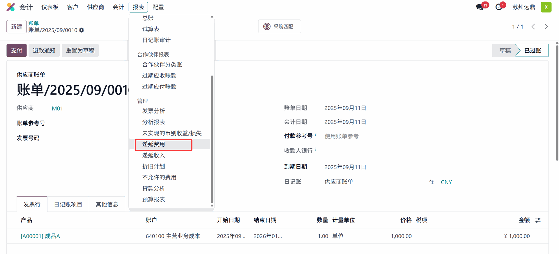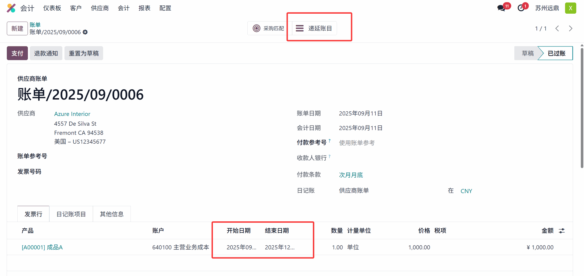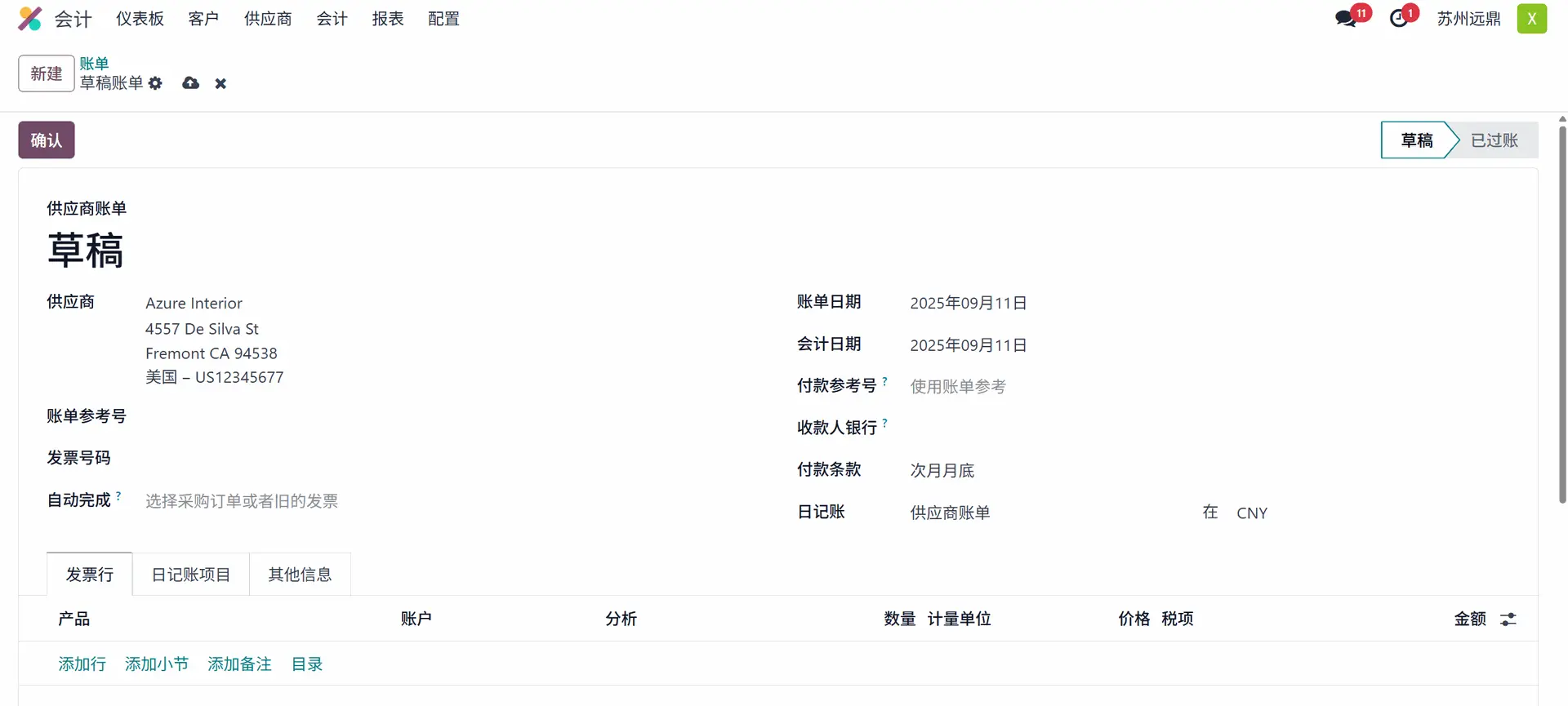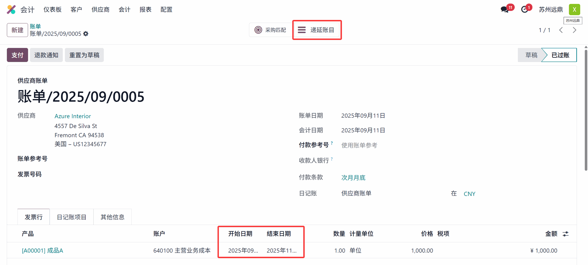• 添加供应商、产品(成品A,1000人民币)、开始日期2025年9月11日、结束日期2025年12月31日,确认账单(此时不会自动生成日记账分录)。
