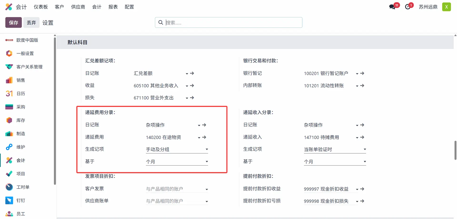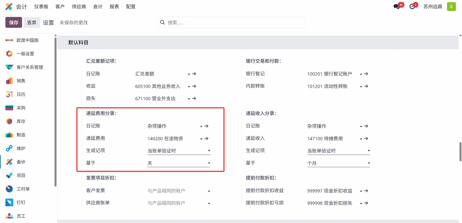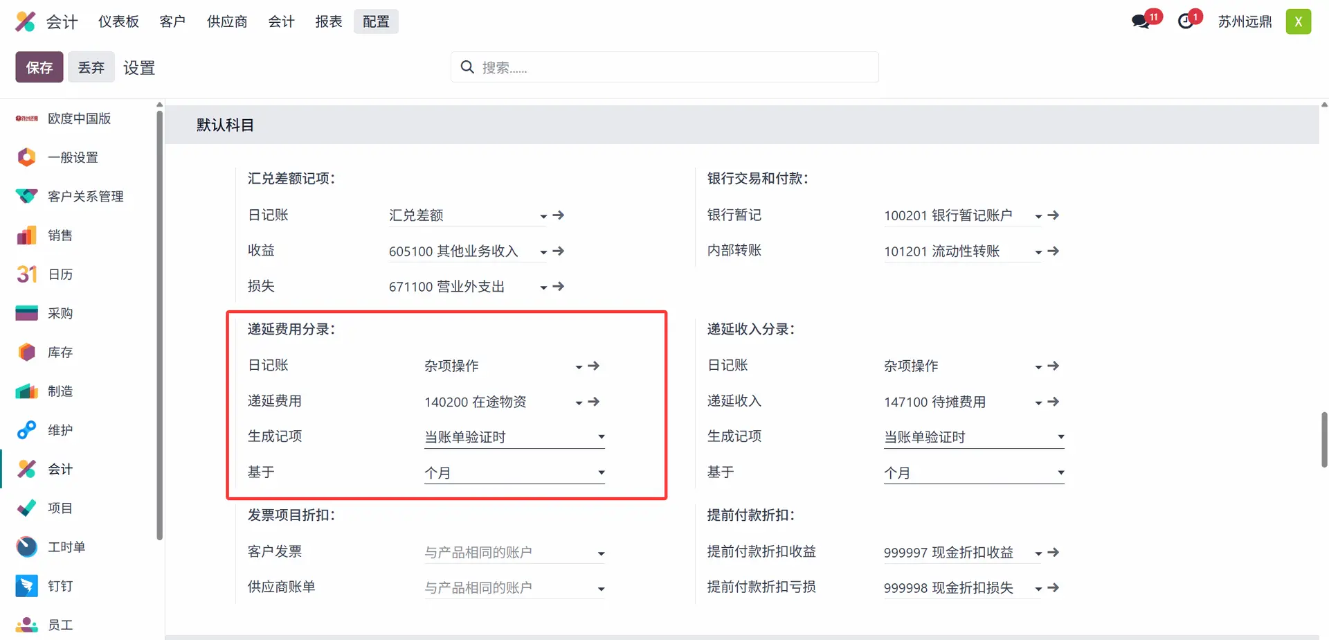 打开会计模块,点击配置菜单,从列表中选择设置。在“默认科目”部分,用户可以查看递延费用分录,如下图所示: