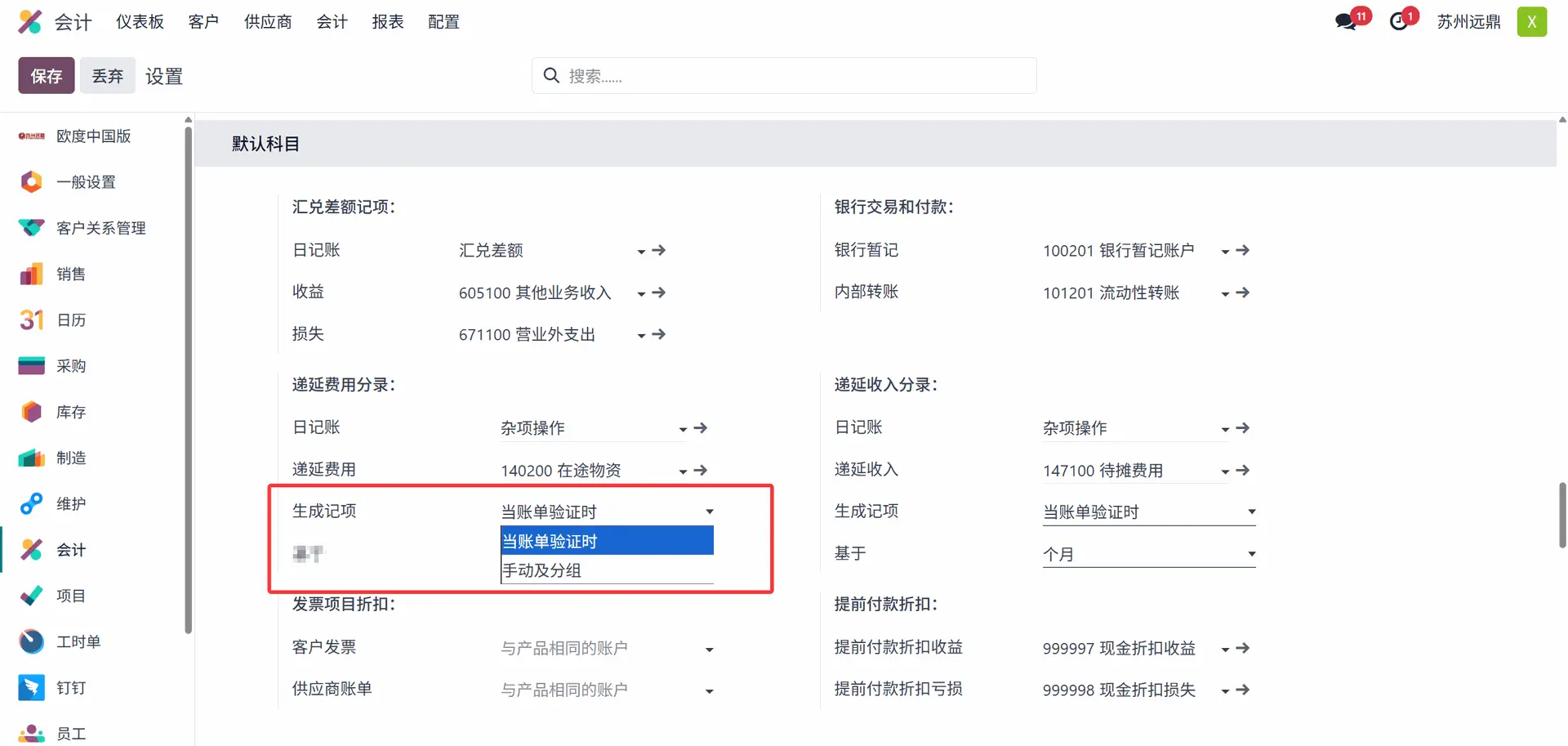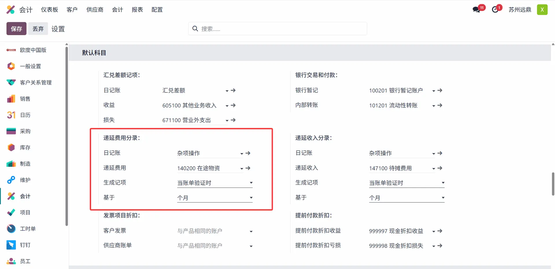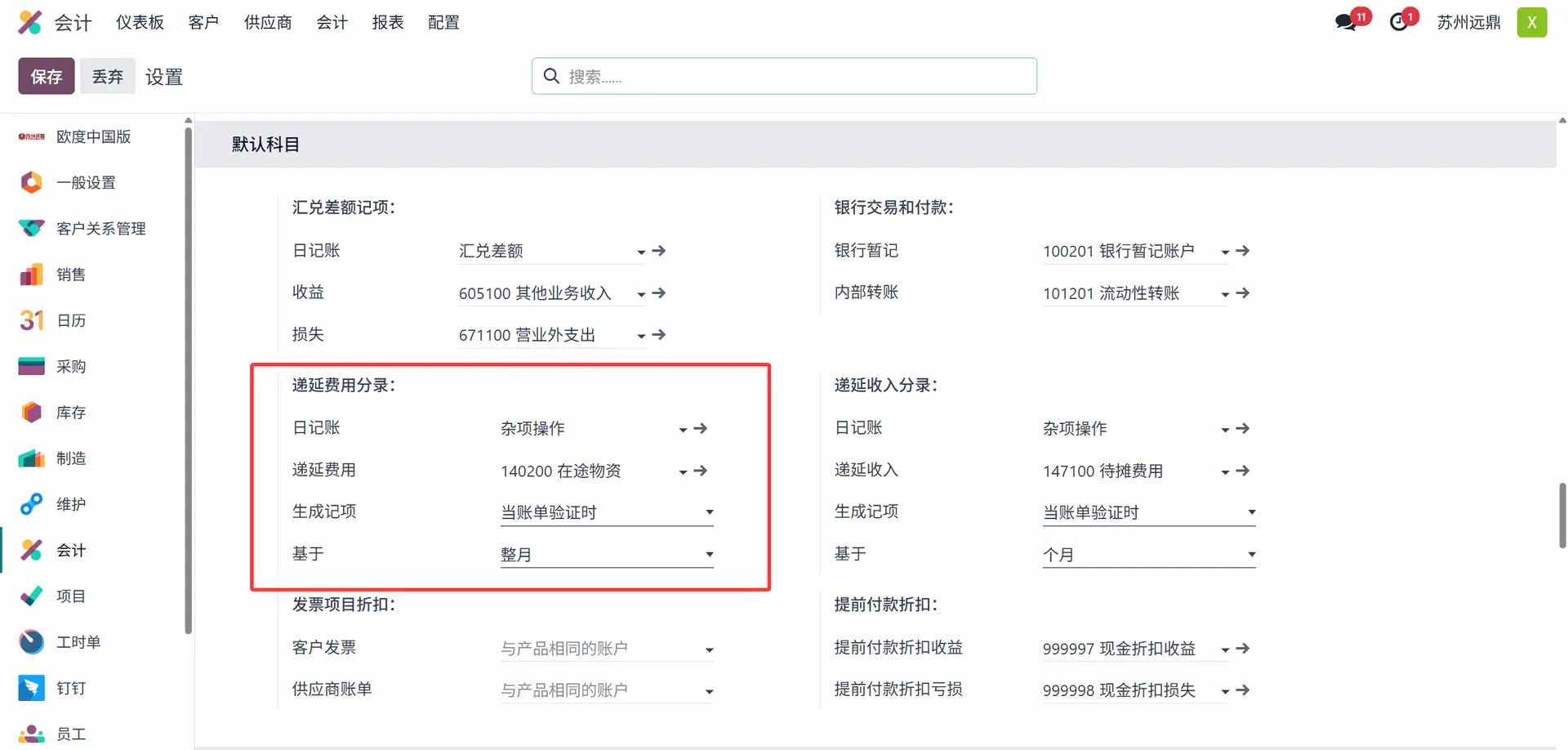 打开会计模块,点击配置菜单,从列表中选择设置。在“默认科目”部分,用户可以查看递延费用分录,如下图所示: