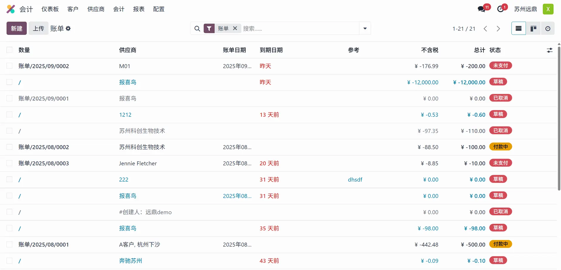 • 列表视图包含账单编号、供应商、账单日期、到期日、参考、不含税金额、总额和状态等信息。可点击上传按钮上传账单,或点击新建按钮添加新账单。