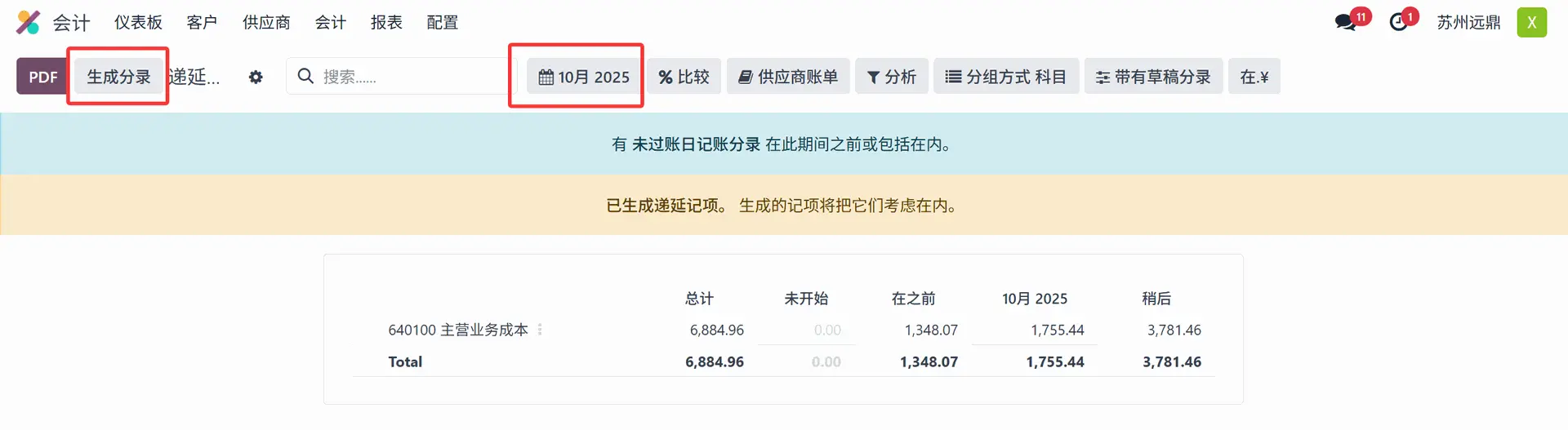 • 切换报告筛选条件至下个月(如10月2025),再次点击生成分录,重复上述步骤。