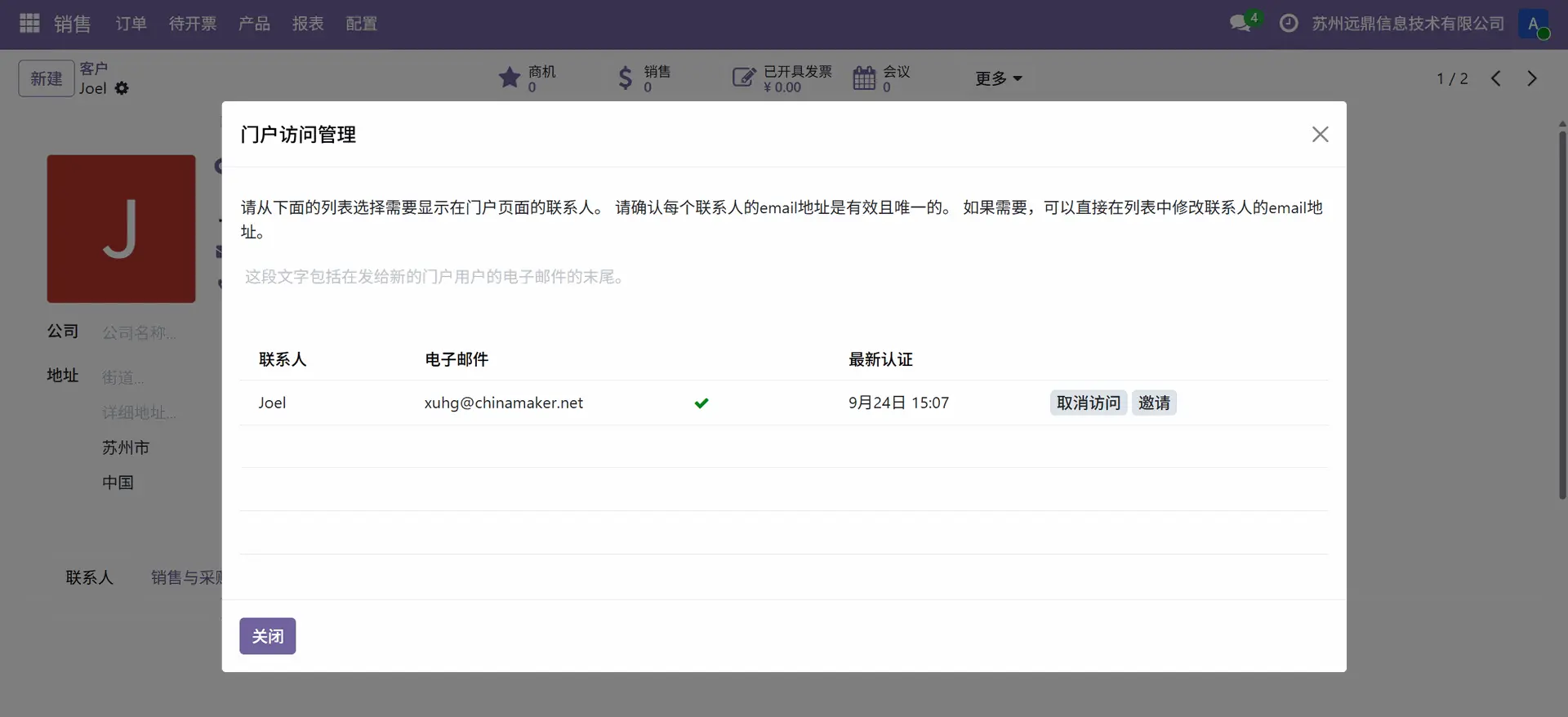 客户需通过 “客户门户(Customer Portal)” 完成线上签名与付款,因此需先为客户配置门户访问权限(门户用户为外部用户,仅能查看内容,无法编辑)。