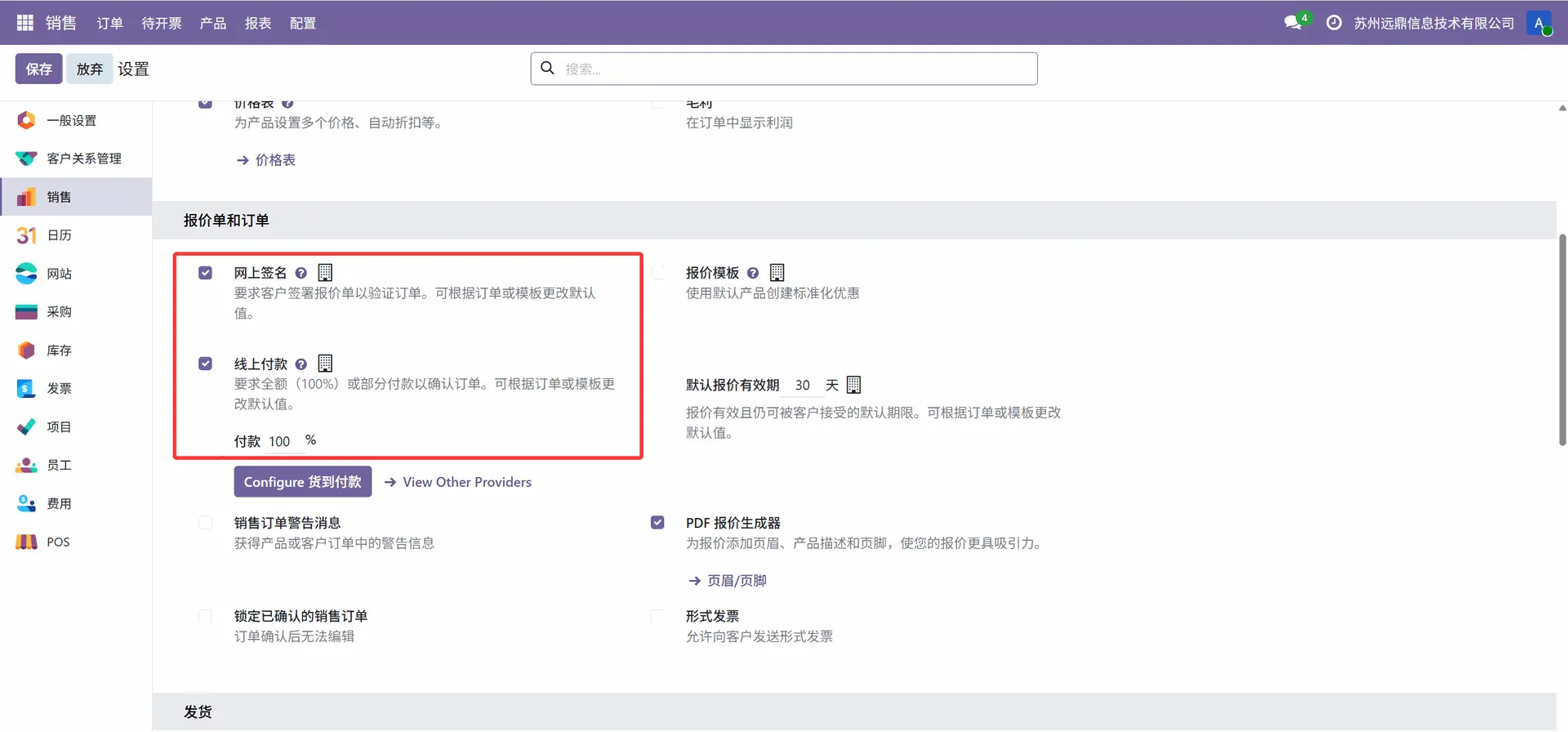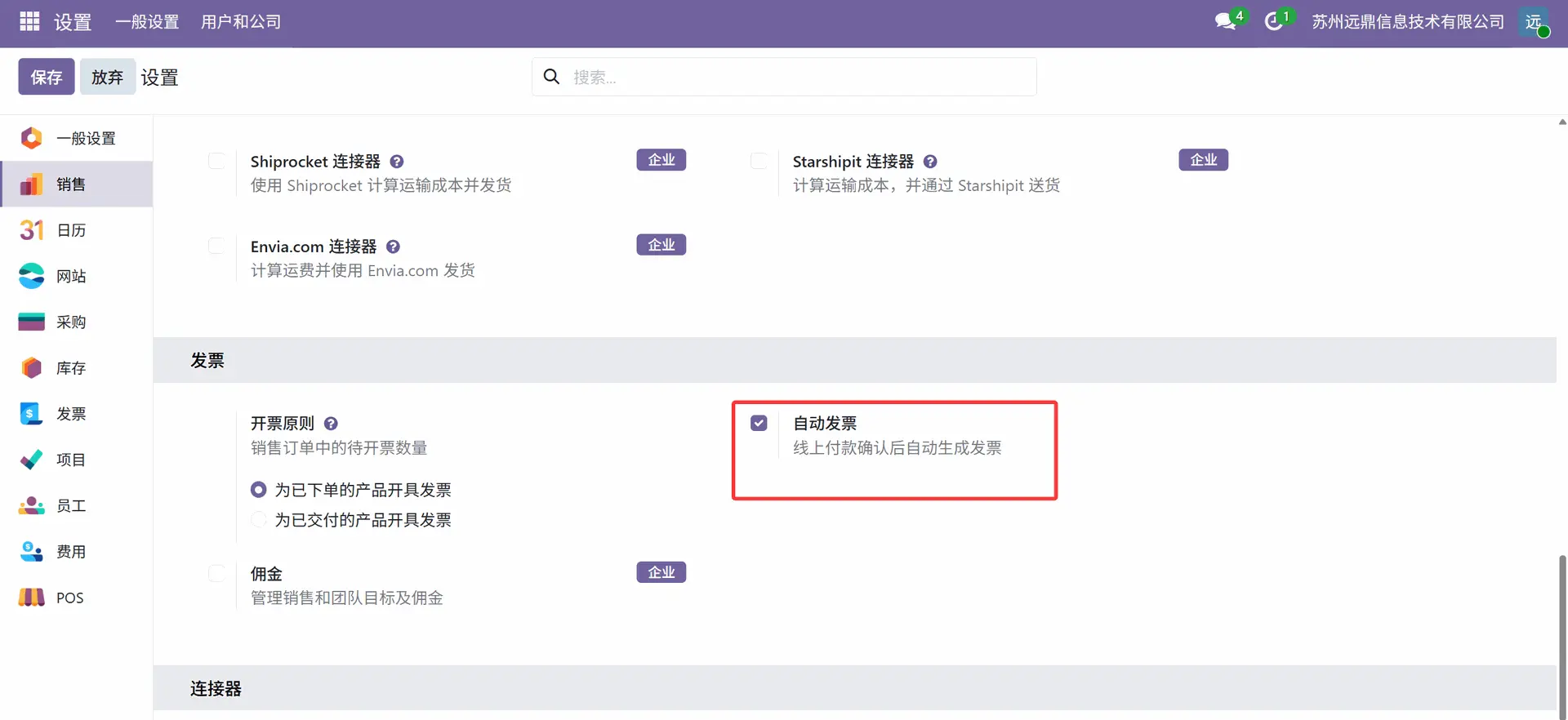 步骤 1:在 Odoo 19 销售模块中启用自动发票功能