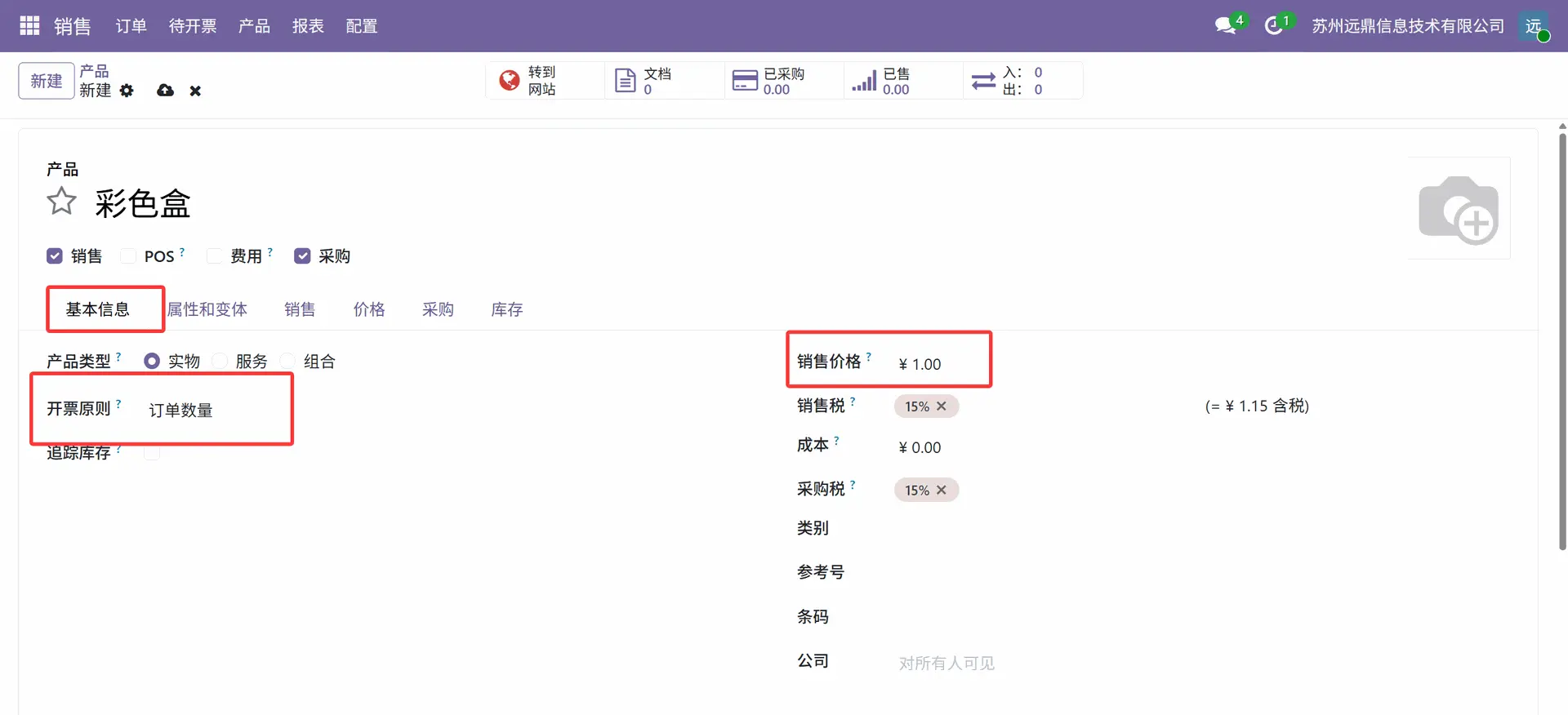 在新屏幕的"产品名称"字段中添加"彩色盒"。在"通用信息"选项卡下选择"按订单数量发票"策略选项。输入必要的产品详细信息后,点击"保存"按钮。