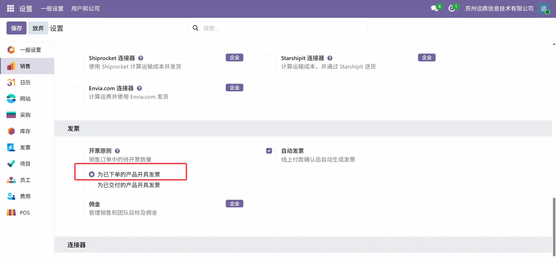 如果启用了"自动发票"选项,客户的线上付款确认后将自动生成发票。此外,您需要开启"按订购内容发票"功能,该功能位于"开票原则"部分下方。启用所需功能后,点击设置中的"保存"按钮。