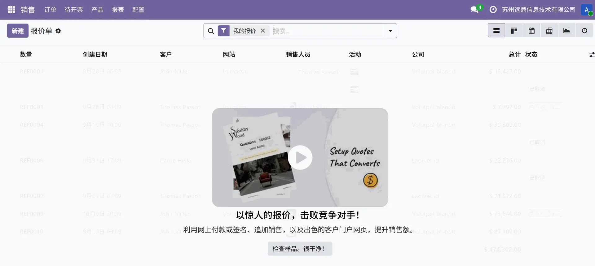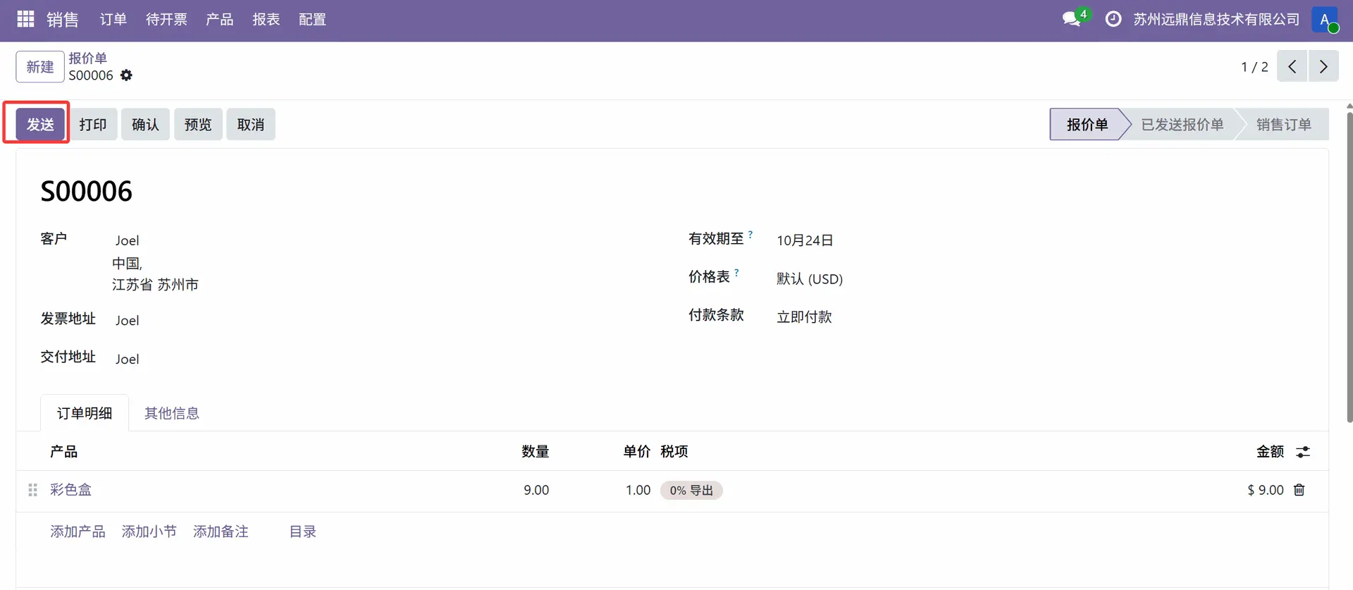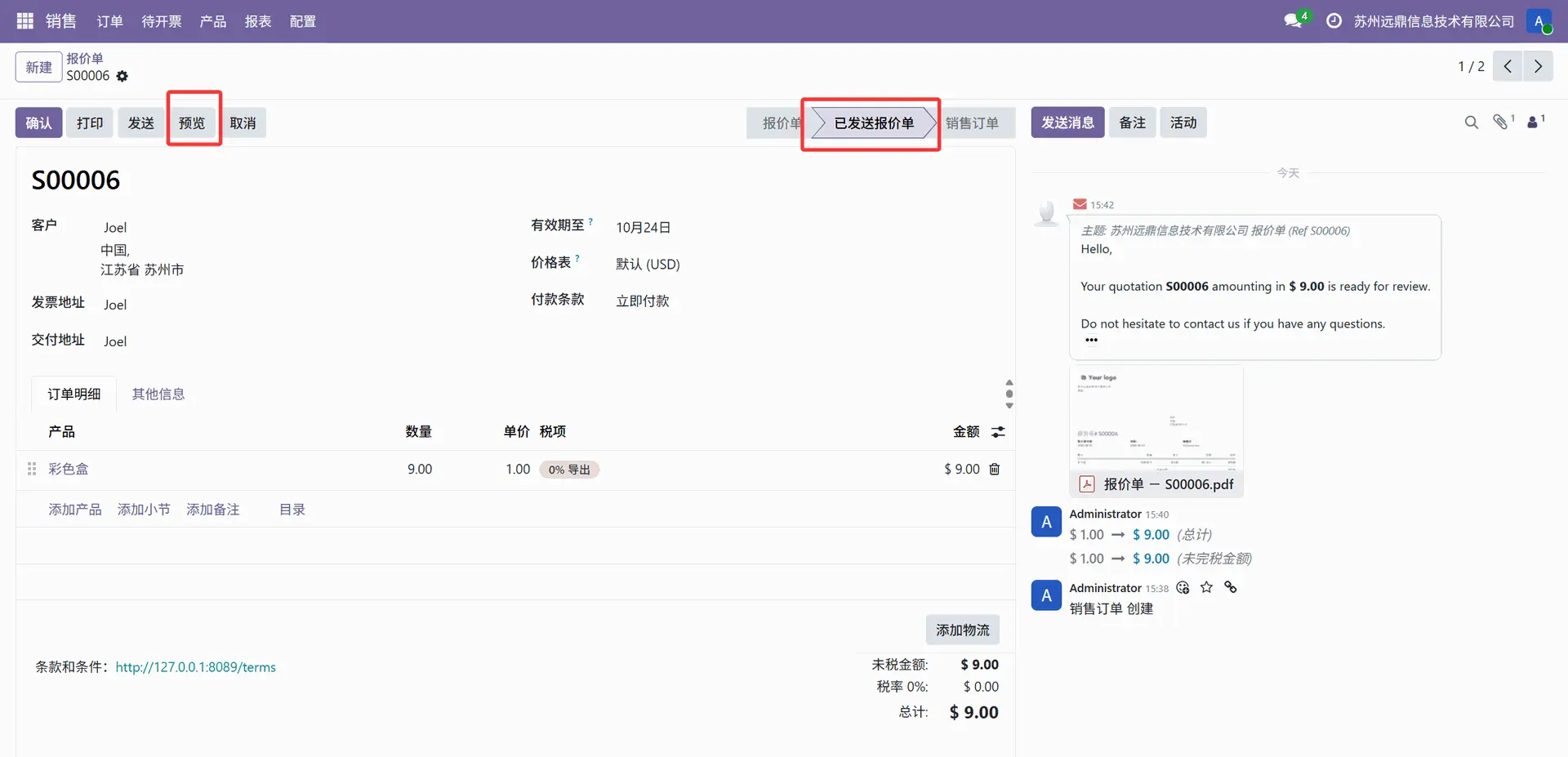 邮件发送后,阶段将从"报价单"变为"已发送报价单"。您可以通过点击销售订单窗口中的"预览"智能按钮访问客户门户。