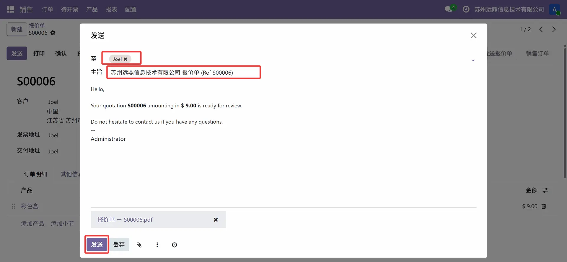将打开一个新窗口,您可以在"至"字段中查看客户的详细信息。您还可以查看和编辑"主题"和"电子邮件正文",如下面的屏幕截图所示。此外,您可以通过点击 Odoo 窗口中的附件图标来上传附加文档。输入所有必要信息后,点击"发送"按钮,如下面的屏幕截图所示。