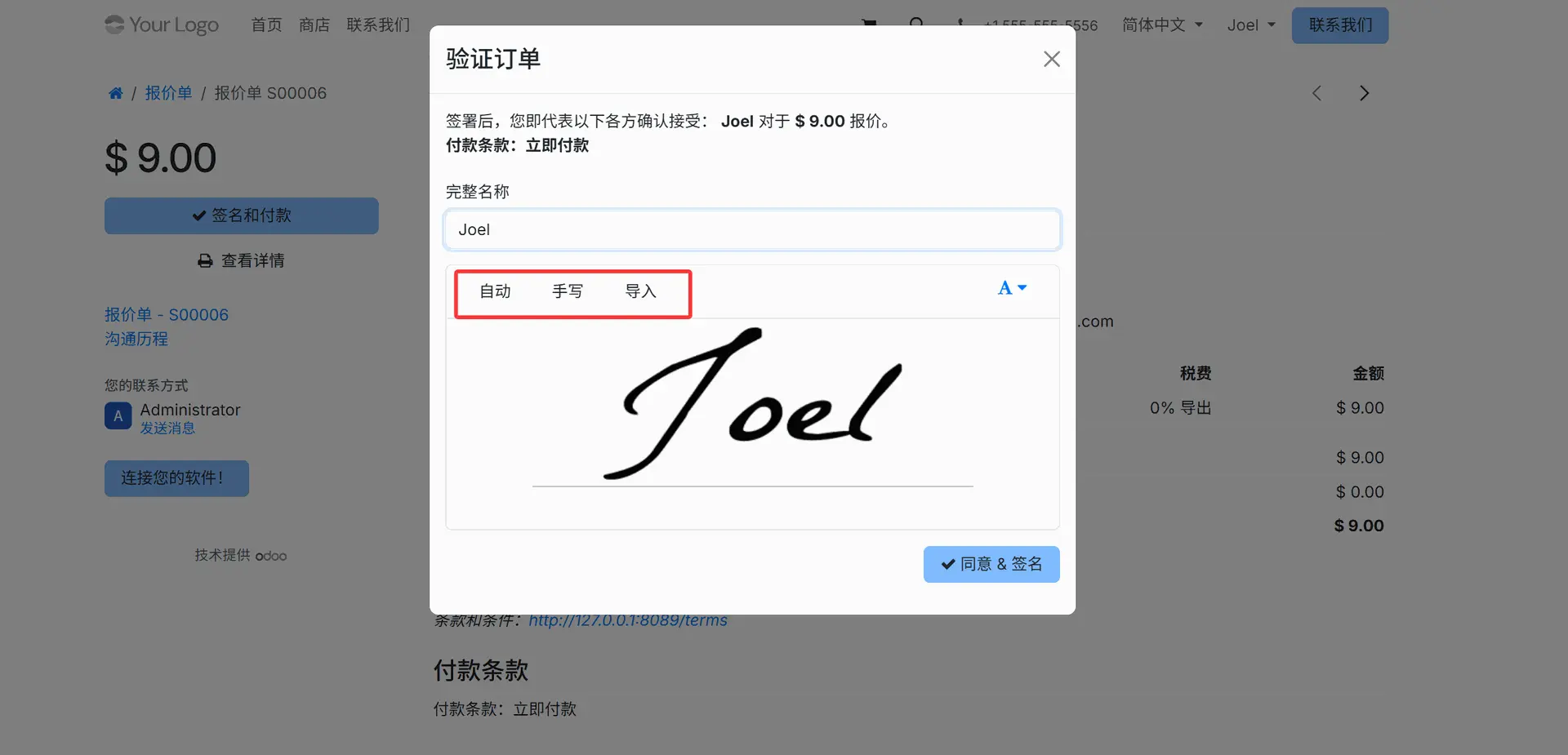 系统会为客户显示一个确认订单窗口,要求其在报价单上签名。他们可以使用"自动" (Auto)、“手写” (Draw) 或"导入" (Load) 选项进行签名,如下面的截图所示。