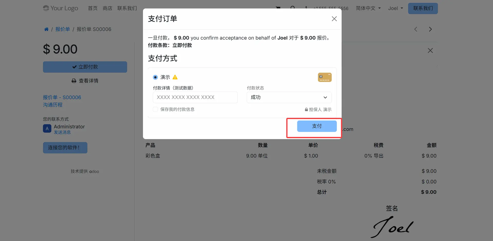 这里,我们选择"自动" (Auto) 选项,并点击"同意&签名" (Accept & Sign) 按钮,如上图所示。接下来,我们继续进行报价单的支付步骤。选择适当的支付方式后,点击"支付订单" (Validate Order) 窗口中的"支付" (PAY) 图标。