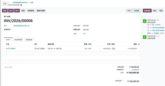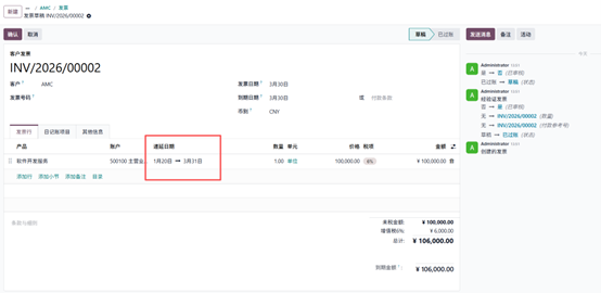 - 创建新发票,客户仍为AMC,产品为订阅计划,设置递延期间为 2026 年 3 月 1 日至 2026 年 6 月 30 日,开票日期为 3 月 30日,确认发票。