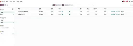在 Odoo 19 库存模块的「作业」菜单下,可打开补货板块管理库存补货业务。该界面会展示系统中已配置的全部补货规则与补货申请清单,如下图所示。