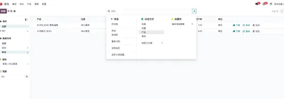 界面顶部设有功能强大的搜索栏,帮助用户快速查找特定记录。筛选与分组功能可支持按已归档、手动、自动、待采购、未延后、库位、产品、产品类别等条件整理数据。系统还提供自定义筛选与自定义分组选项,用户可根据仓库位置或其他预设条件对信息进行排序。
