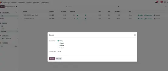 随后需设定产品的最低与最高库存限额,该阈值将控制系统启动补货的时机。输入所需的「采购数量」后,Odoo 提供两种选择:创建一次性采购订单(单次采购),或启用自动补货(自动订单),当库存低于设定最低水平时自动生成订单。