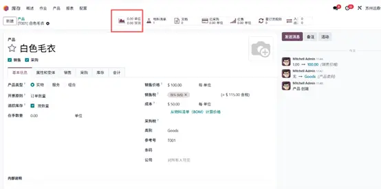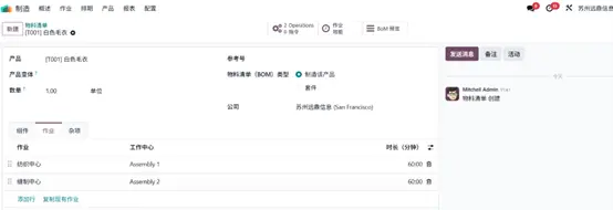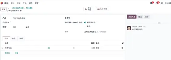 点击智能菜单中的 物料清单(Bill of Materials) 选项,系统将弹出新窗口,展示为 “白色毛衣” 产品创建的物料清单,可直接用于生产。组件(Components) 选项卡中列示了生产该产品所需的全部原材料,本例中原材料库存充足,可满足大批量生产需求。
