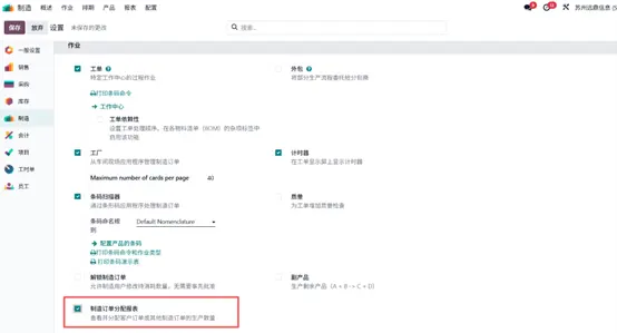 随后进入配置(Configuration)> 设置(Settings),启用 生产订单物料分配报表(Allocation Report for Manufacturing Orders) 选项,以便生成生产订单物料分配报表,操作完成后保存设置。