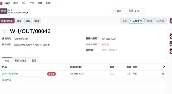 第二张交货单为Azure Interior创建,需求为 5 件毛衣,计划交货日期为 4 月 26 日。库存同样无法满足需求,产品可用状态显示为无库存,该交货单也处于待处理状态。