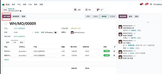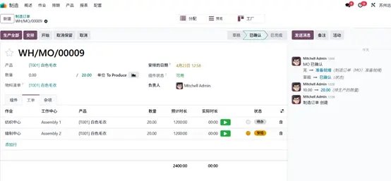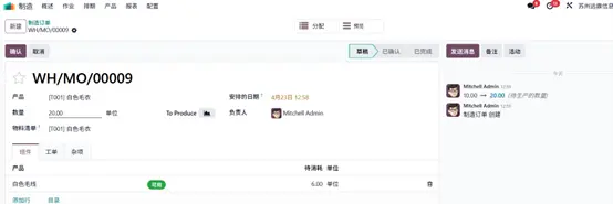 三位客户对同一产品提出了不同数量的采购需求,基于此,企业决定启动该产品生产。返回生产模块开始生产流程,在 数量(Quantity) 字段中录入 “白色毛衣” 产品生产数量 20 件,系统将自动更新对应物料清单信息。