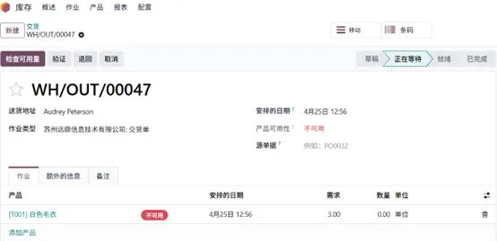 第三张交货单为Audrey Peterson创建,需求为 3 件毛衣,计划交货日期为4月 25 日。库存无法满足需求,产品可用状态显示为无库存,该交货单同样处于待处理状态。