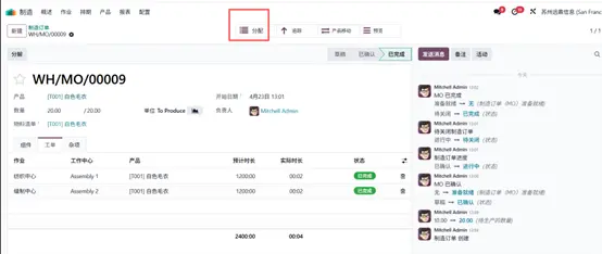 至此生产流程全部结束,点击 分配(Allocation) 智能按钮即可查看物料分配报表。