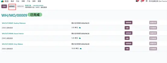 系统将弹出新窗口,展示所有已创建的交货单信息,包括分配申请明细,如交货单编号、客户名称、预计交货日期及需求数量等。点击 全部分配(Assign All) 按钮,将产品库存分配至所有交货订单。