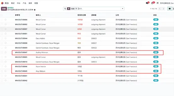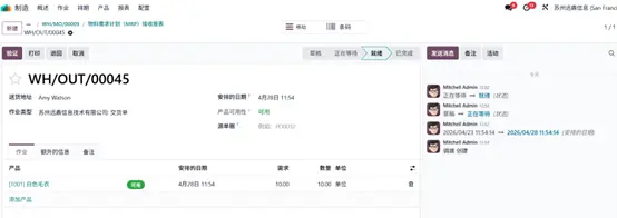 在物料分配报表中点击任意交货单,可进入对应单据详情页,此时选中的订单状态已更新为待发货(Ready)。点击 确认(Validate) 按钮完成发货操作,产品将从库存出库并交付至客户。