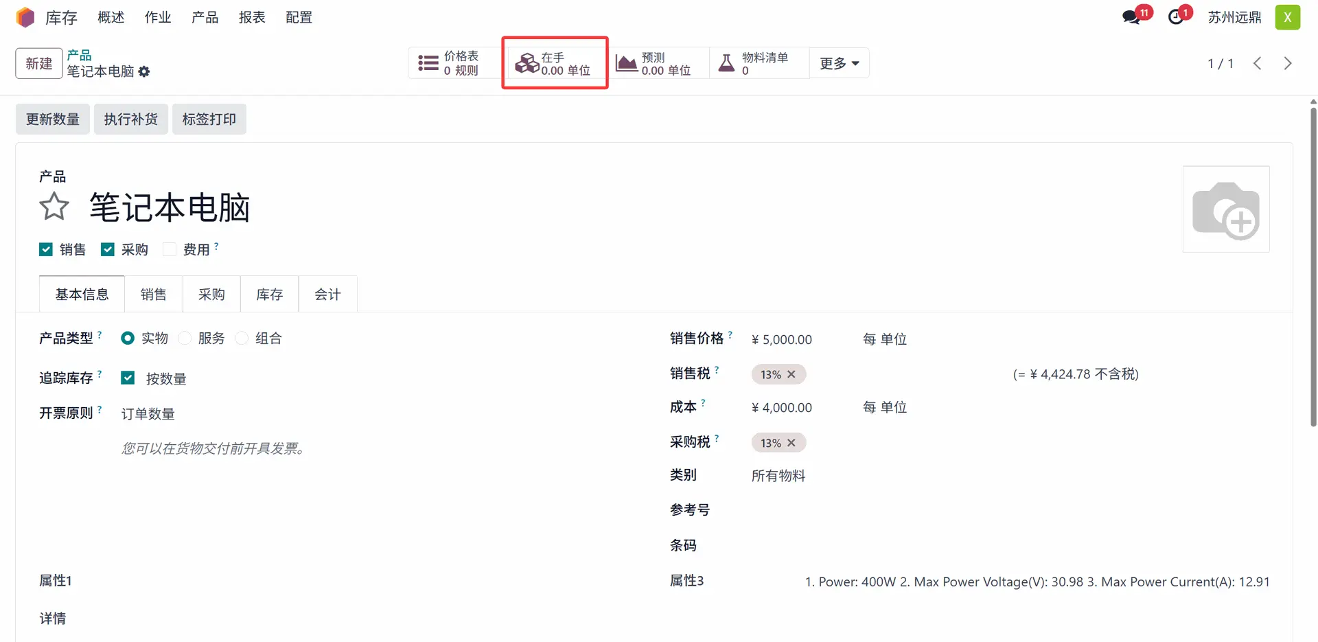 首先创建一个新产品:进入“产品”部分,点击“新建”按钮。产品名称为“笔记本电脑”,是一个可存储产品。当前“在手数量”为零,表示该产品缺货。