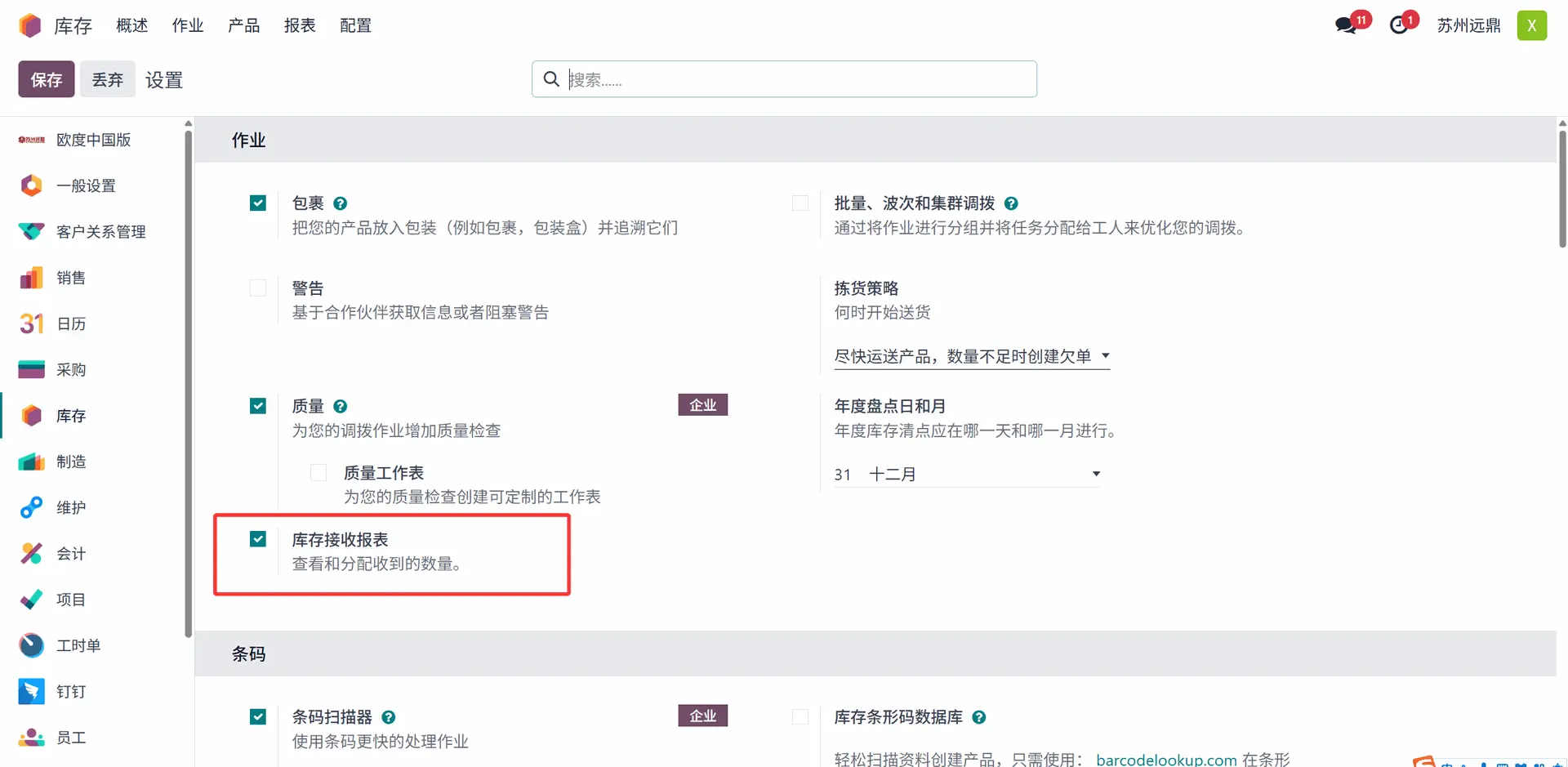 操作路径:设置 > 配置 > 库存接收报表 > 保存