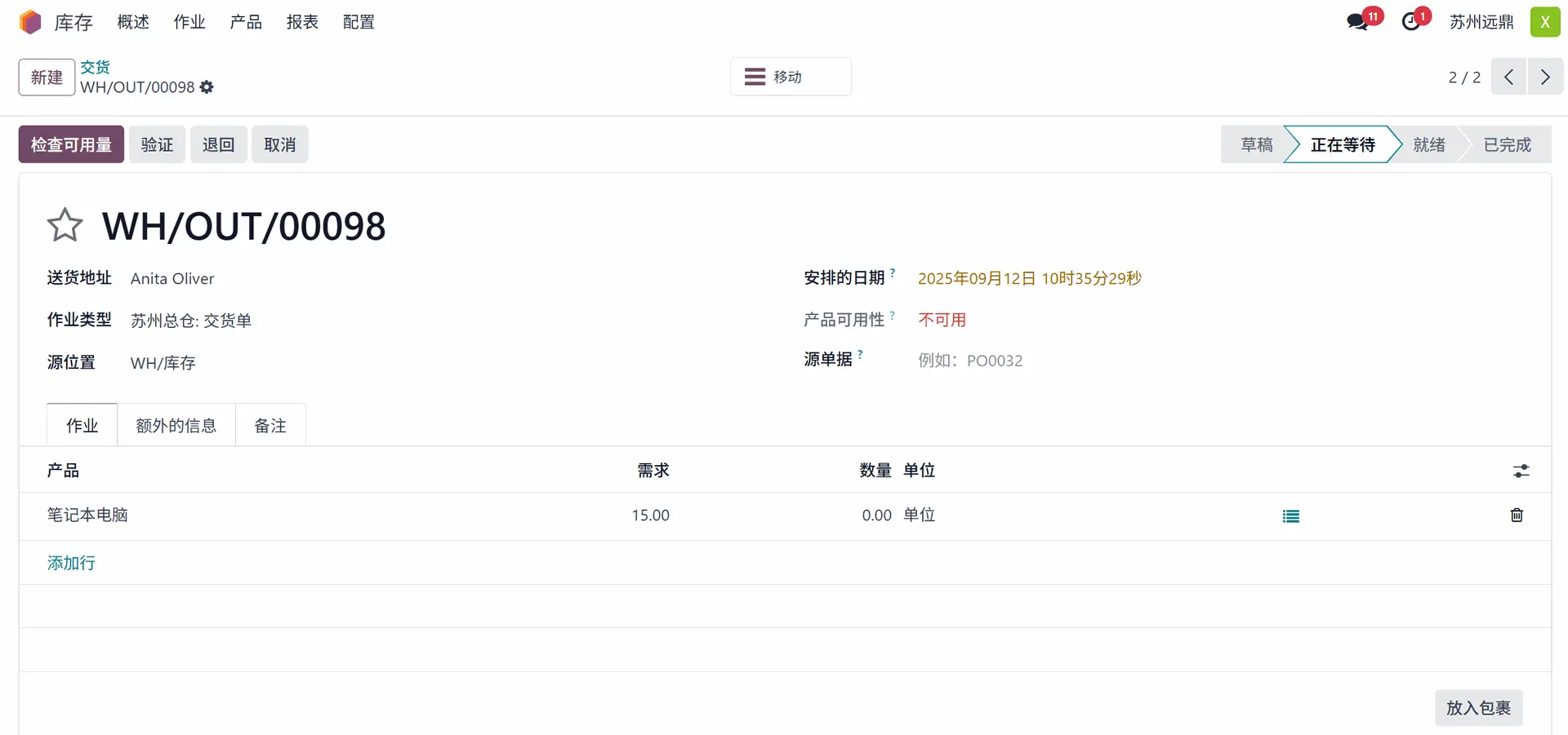 另一位名为 Anita Oliver 的客户请求 15 台同一产品。点击“标记为待办”按钮。随后用户可以从交货单中看到该产品在库存中不可用。
