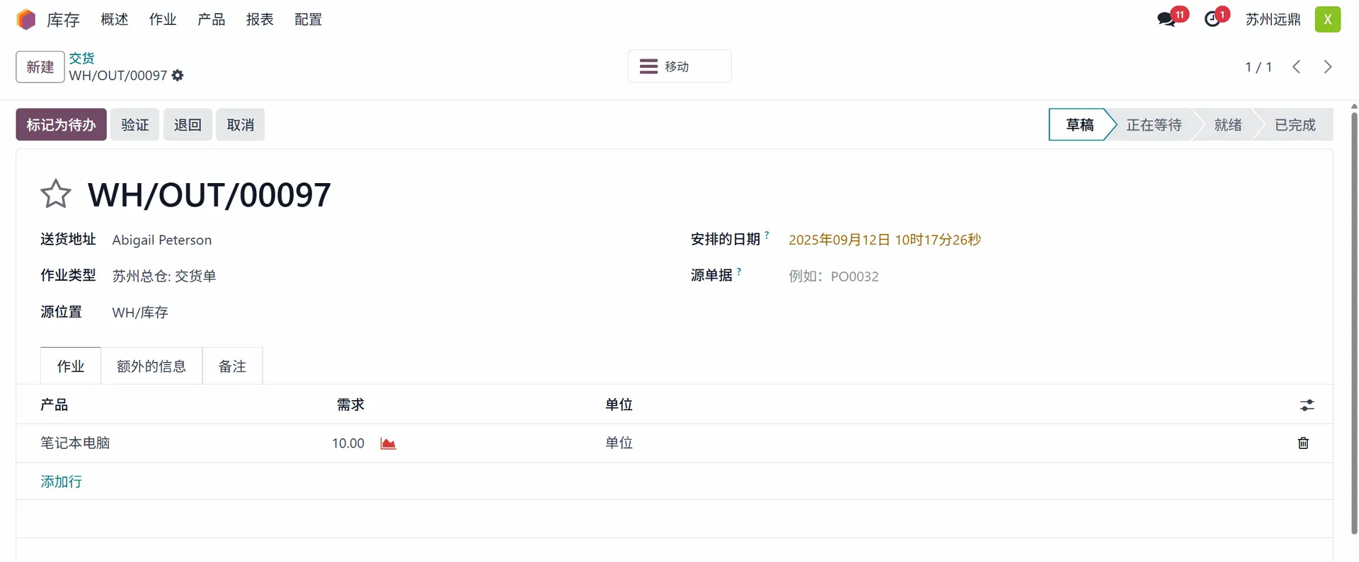 第一个交货调拨是为名为 Abigail Peterson 的客户创建的。该客户需要 10 台笔记本电脑。点击“标记为待办”按钮。