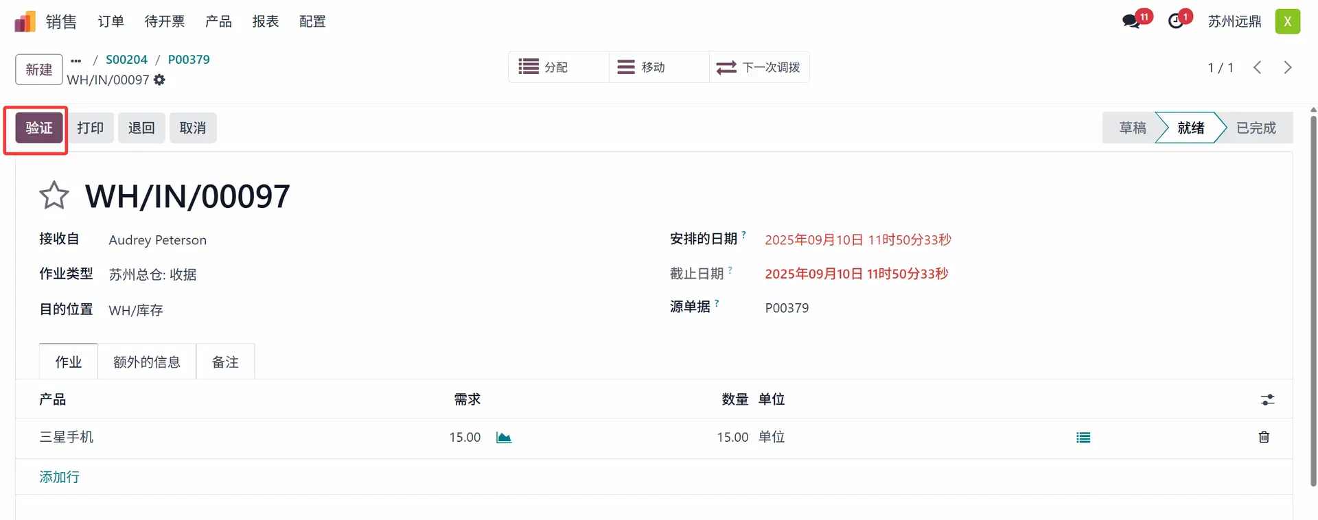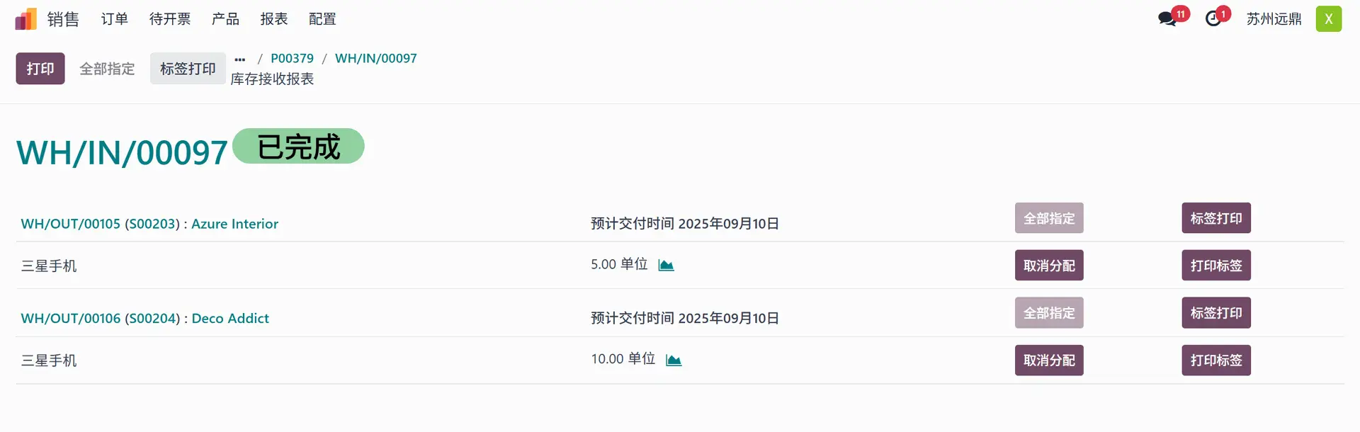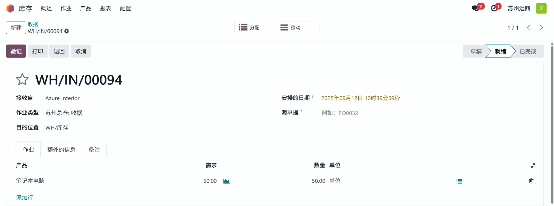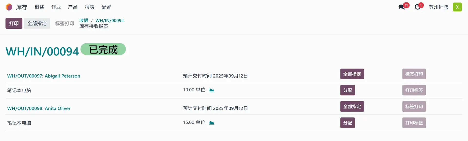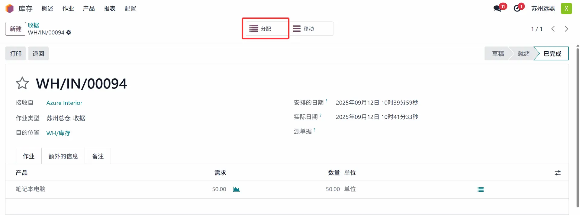 收货阶段将变为“完成”,调拨完成,产品到达库存位置。如下面的截图所示,将会出现一个名为“分配”的智能选项卡。