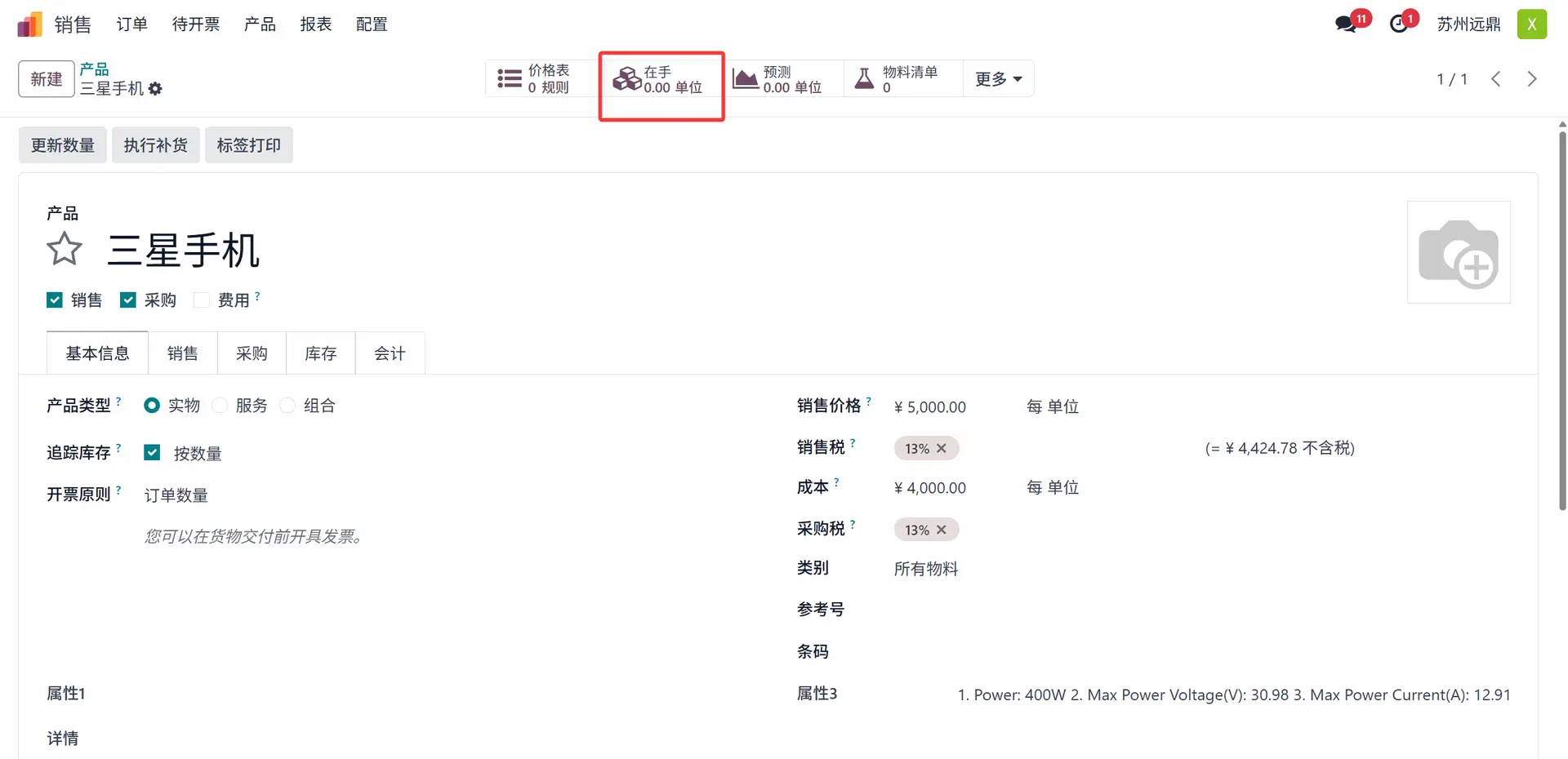 让我们配置一个新产品,名为“三星手机”。添加所有详细信息,如成本、销售价格、税费等。检查产品“在手数量”为零,表示该产品在库存中不可用。