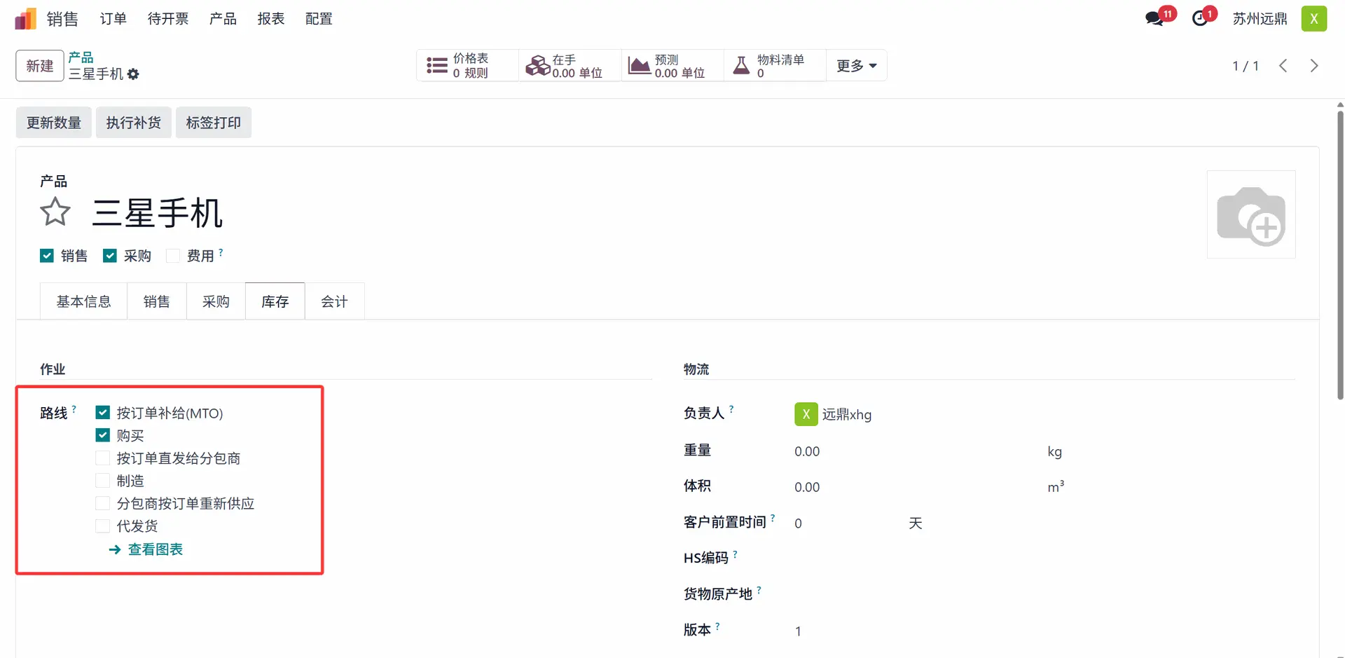 在“库存”选项卡下,用户可以添加产品的路线。首选路线是“按订单补货 (MTO)”和“购买”。