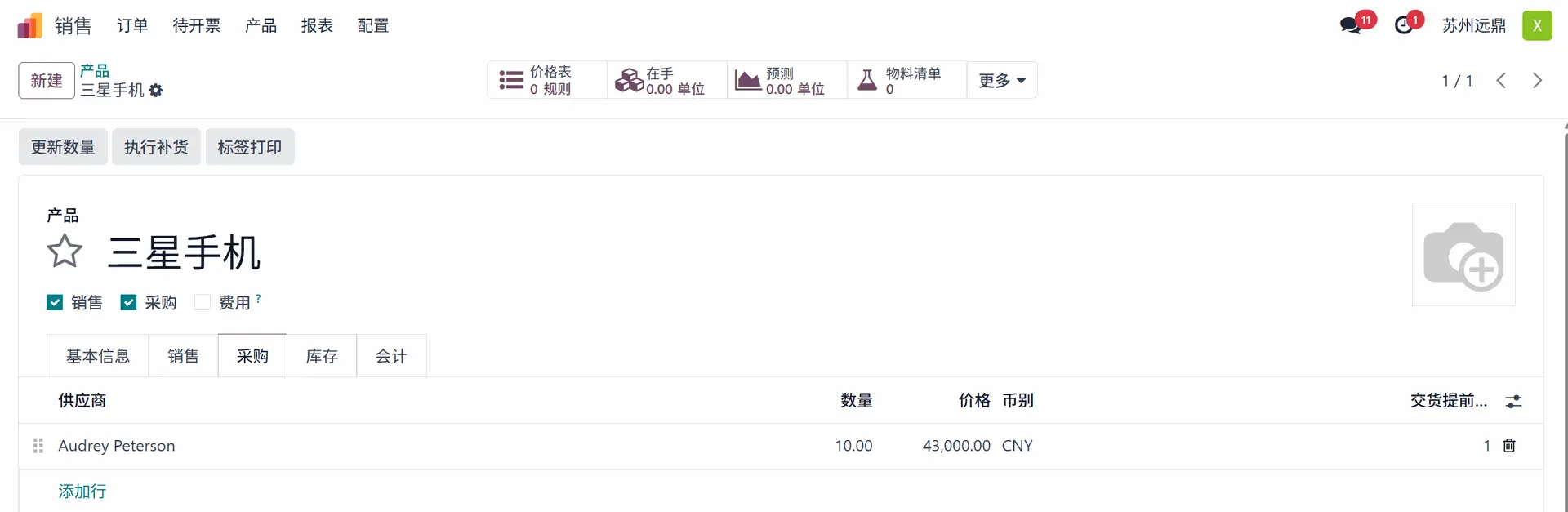 在“采购”选项卡下,用户可以指定供应商名称(产品将从该供应商处采购)。这里提到的供应商是 Audrey Peterson,同时可见供应商价格和交付提前期。