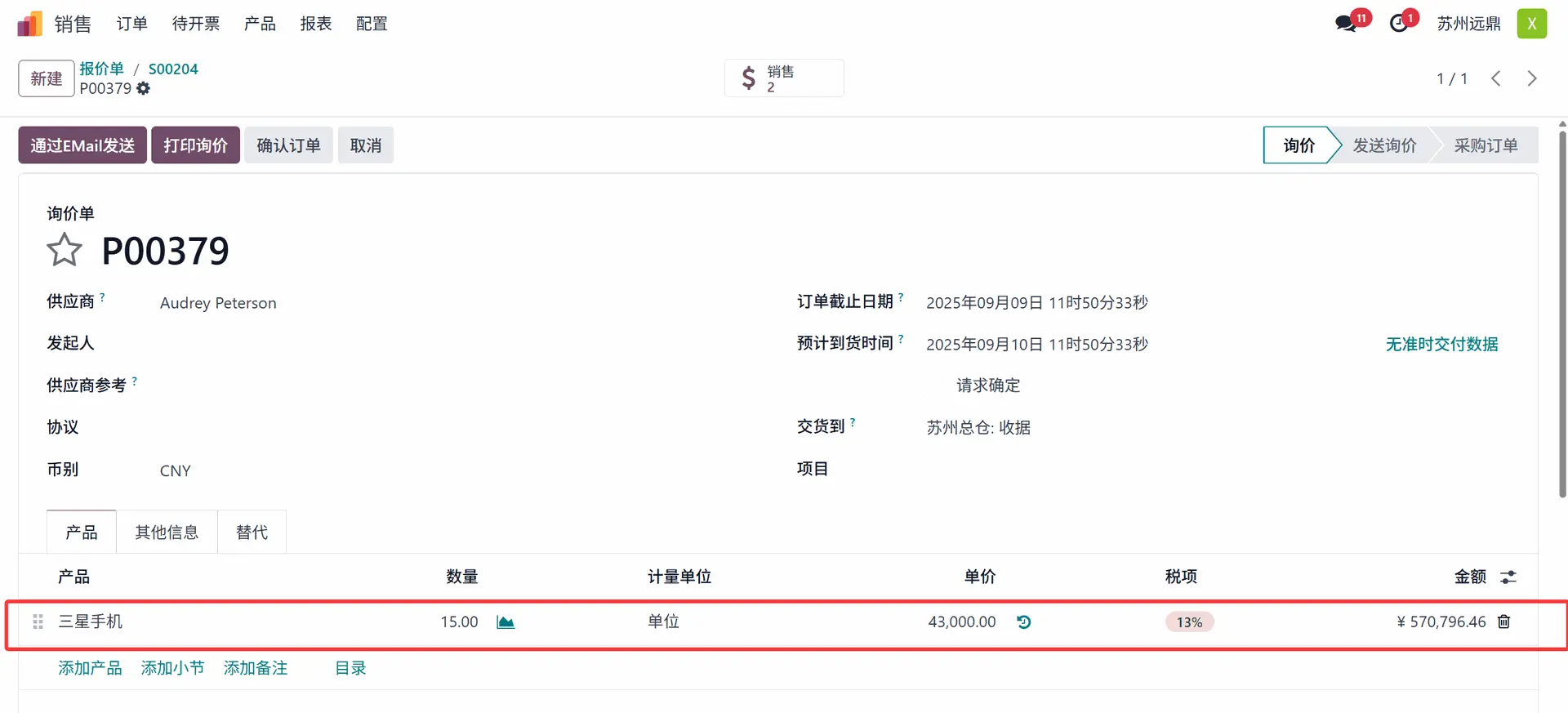 打开采购订单查看,供应商是 Abigail Peterson,与产品中提到的相同。
