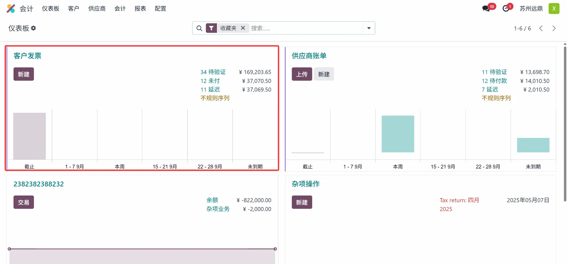 从 Odoo 18 会计应用中可以轻松为客户创建发票。转到会计应用,在会计仪表板中会显示日记账。点击每个日记账对应的“新建”按钮,可以创建该日记账的条目。