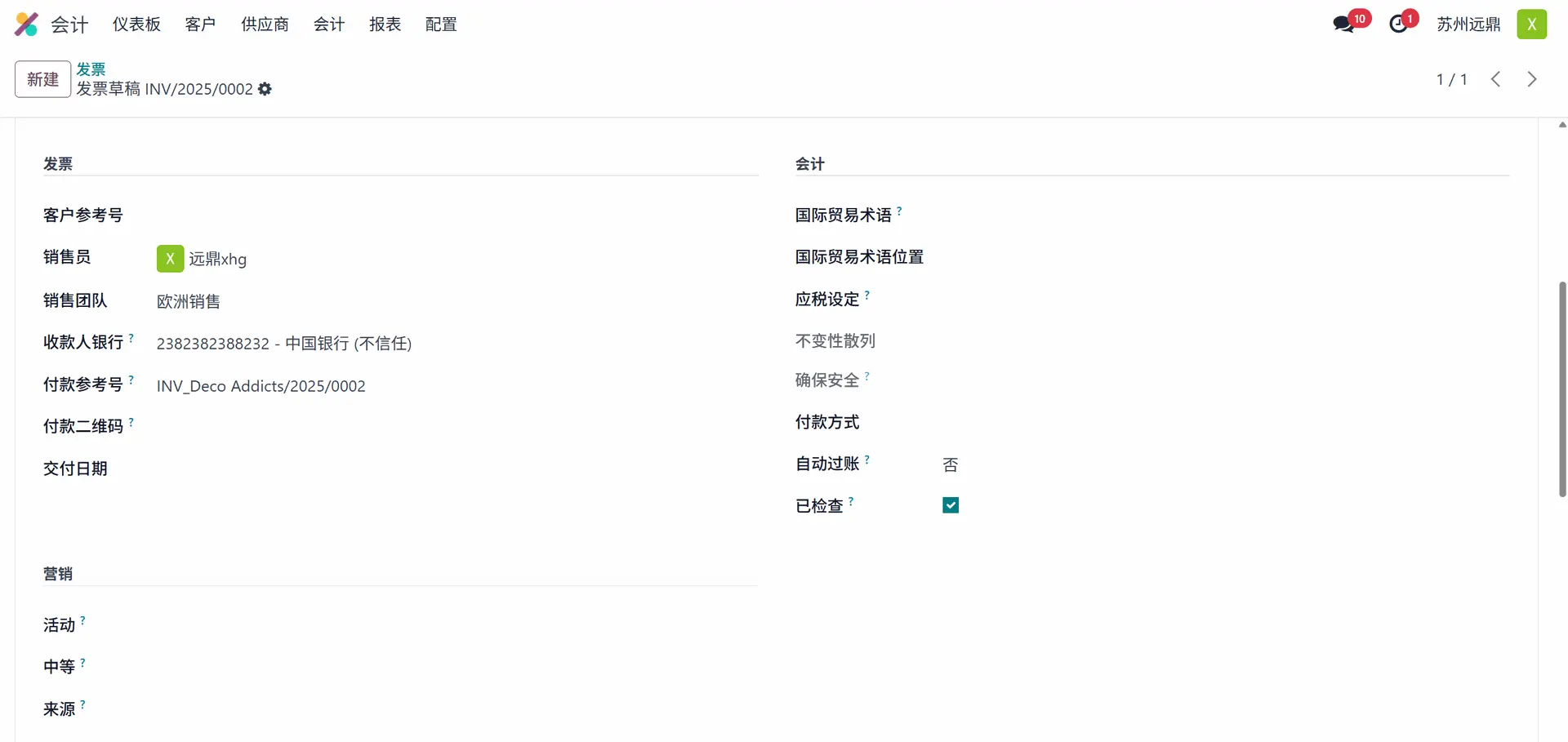 点击“新建”按钮后,Odoo 将提供创建发票的表单。需要填写不同字段,如客户、交货地址、发票日期、付款条款、日记账等。