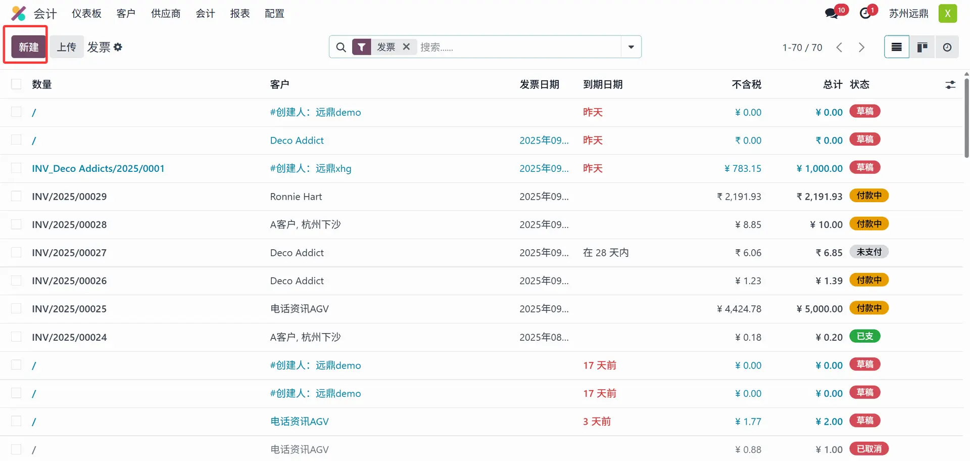 如上图所示,通过点击客户发票部分的“新建”按钮可以创建新的客户发票。或者在“客户”菜单下有一个“发票”子菜单。点击“发票”将显示所有发票。要创建新发票,请点击“新建”按钮。