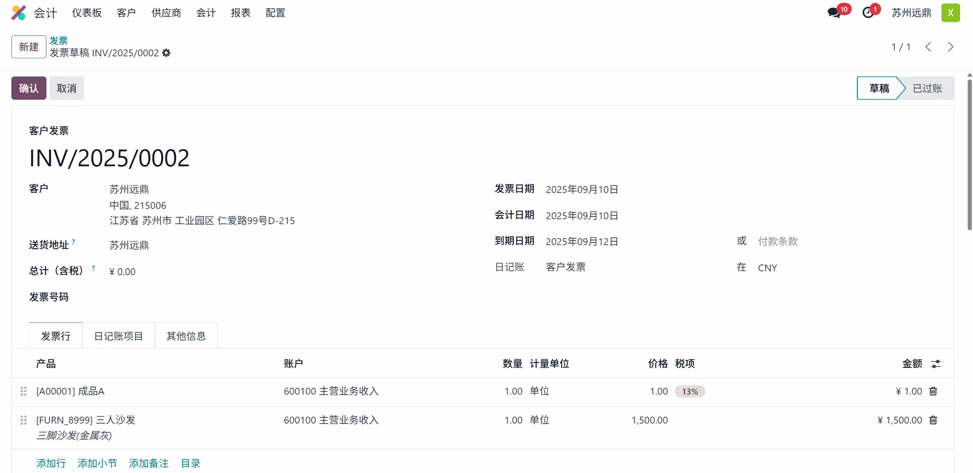正确填写这些字段后,点击“确认”按钮,发票将从草稿状态变为已过账状态。随后将创建与发票对应的日记账条目。转到“日记账项目”选项卡,将显示日记账项目。