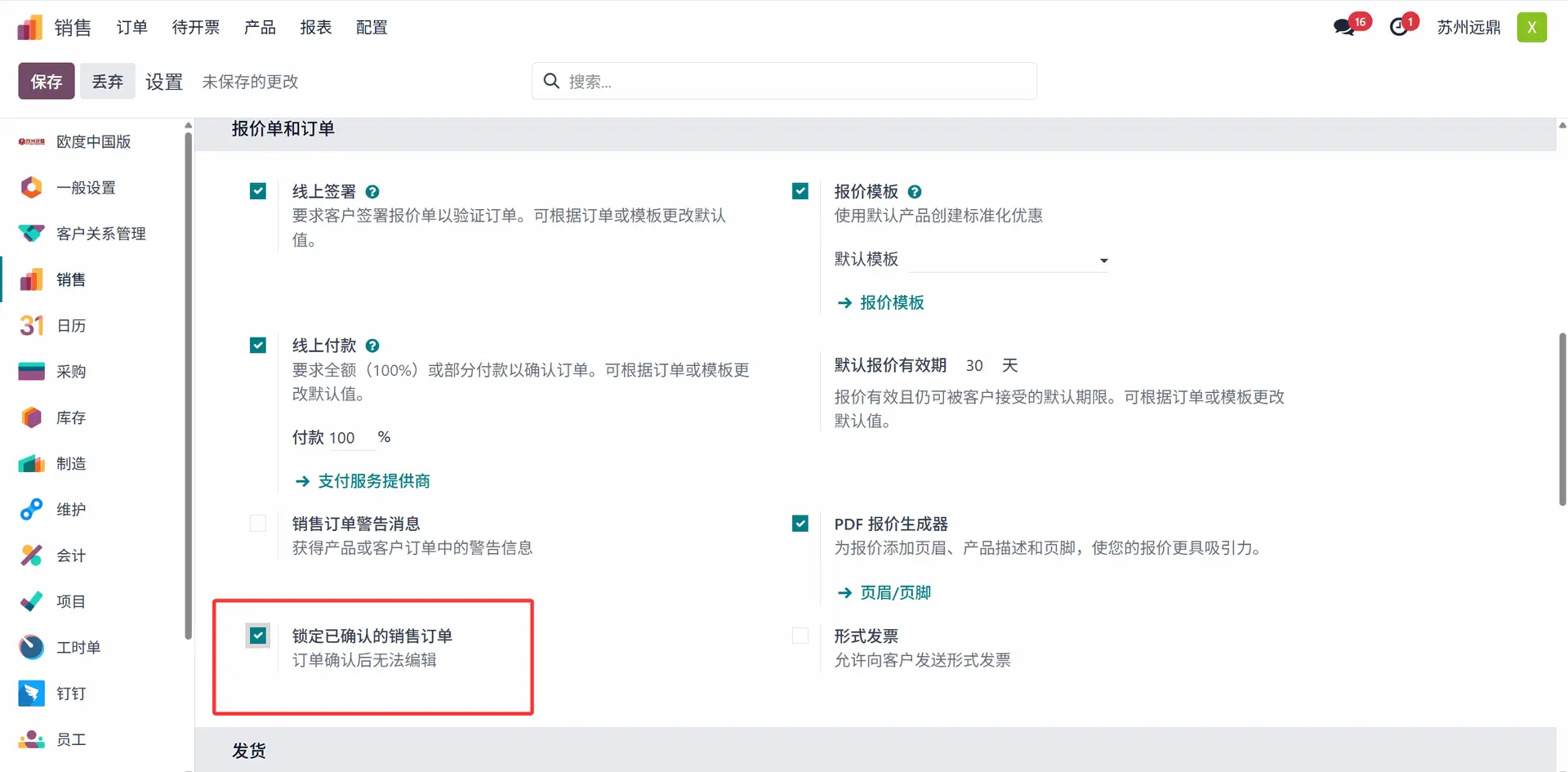 要在 Odoo 18 中锁定已确认的销售订单,您首先需要在销售模块中启用“锁定已确认的销售订单”(Lock Confirmed Sales) 功能。