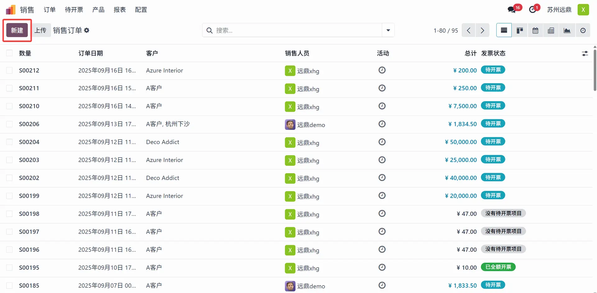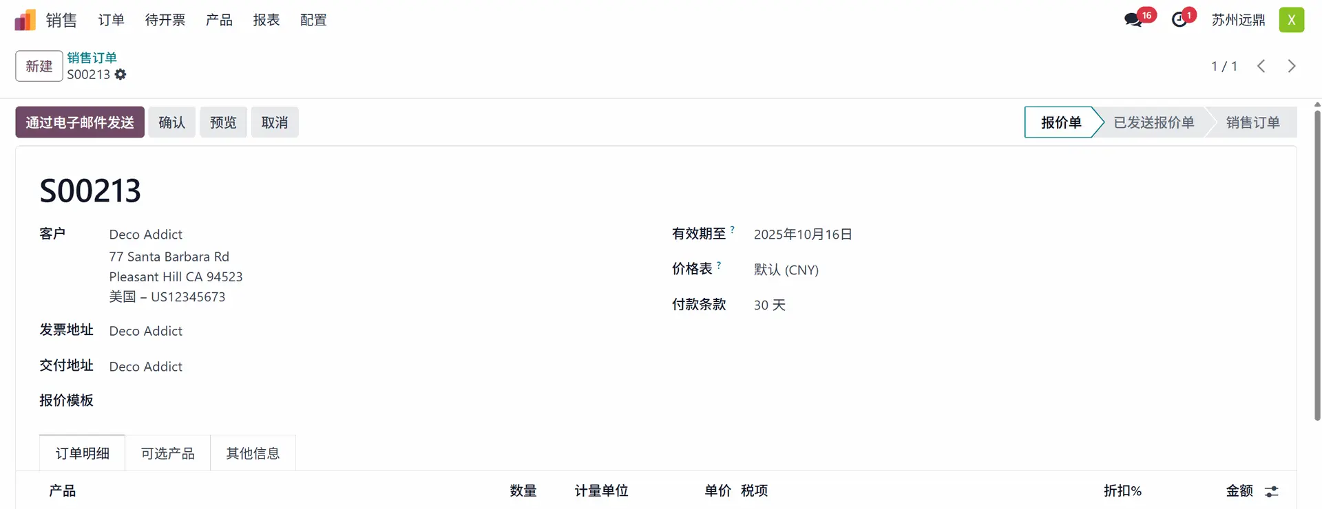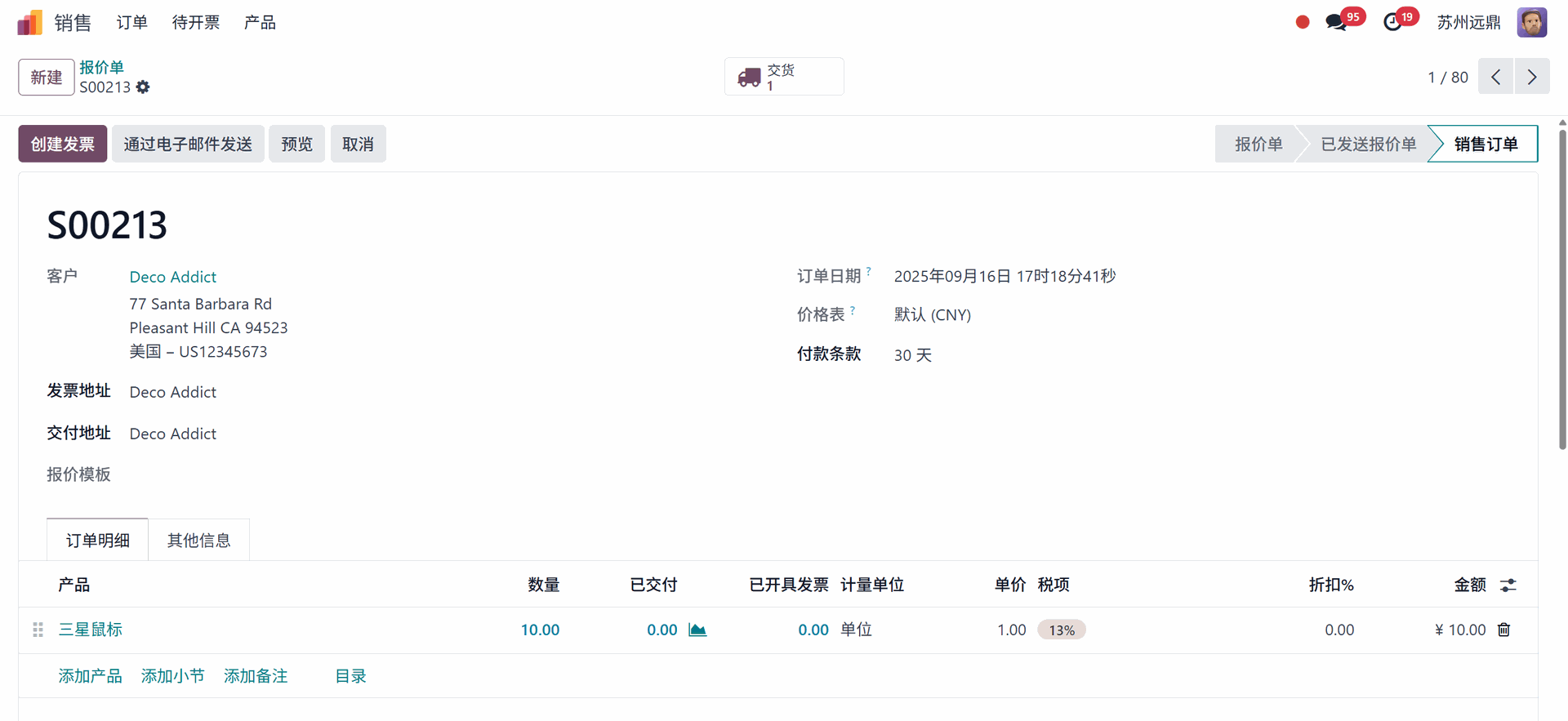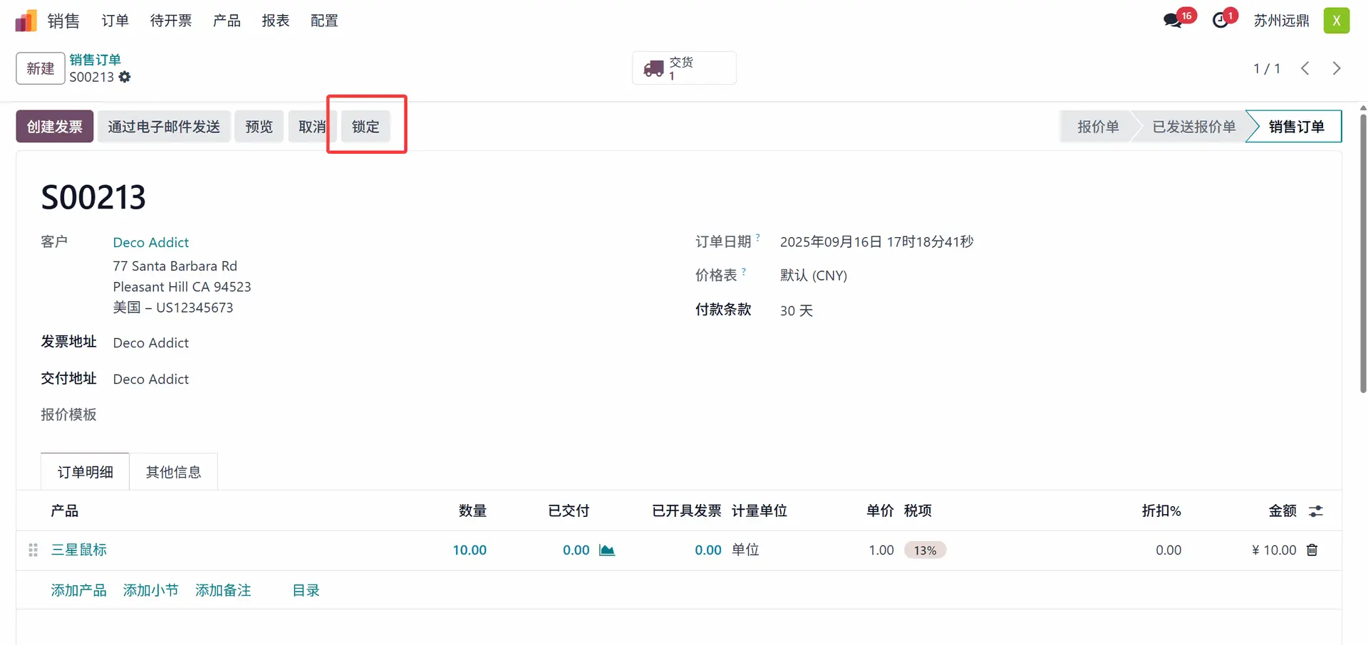订单一旦确认,其状态将从“报价”变为“销售订单”,并生成相应的交货单。此外,右上角会出现一个锁定图标,表明订单数据现已锁定且无法编辑,如下面的屏幕截图所示。