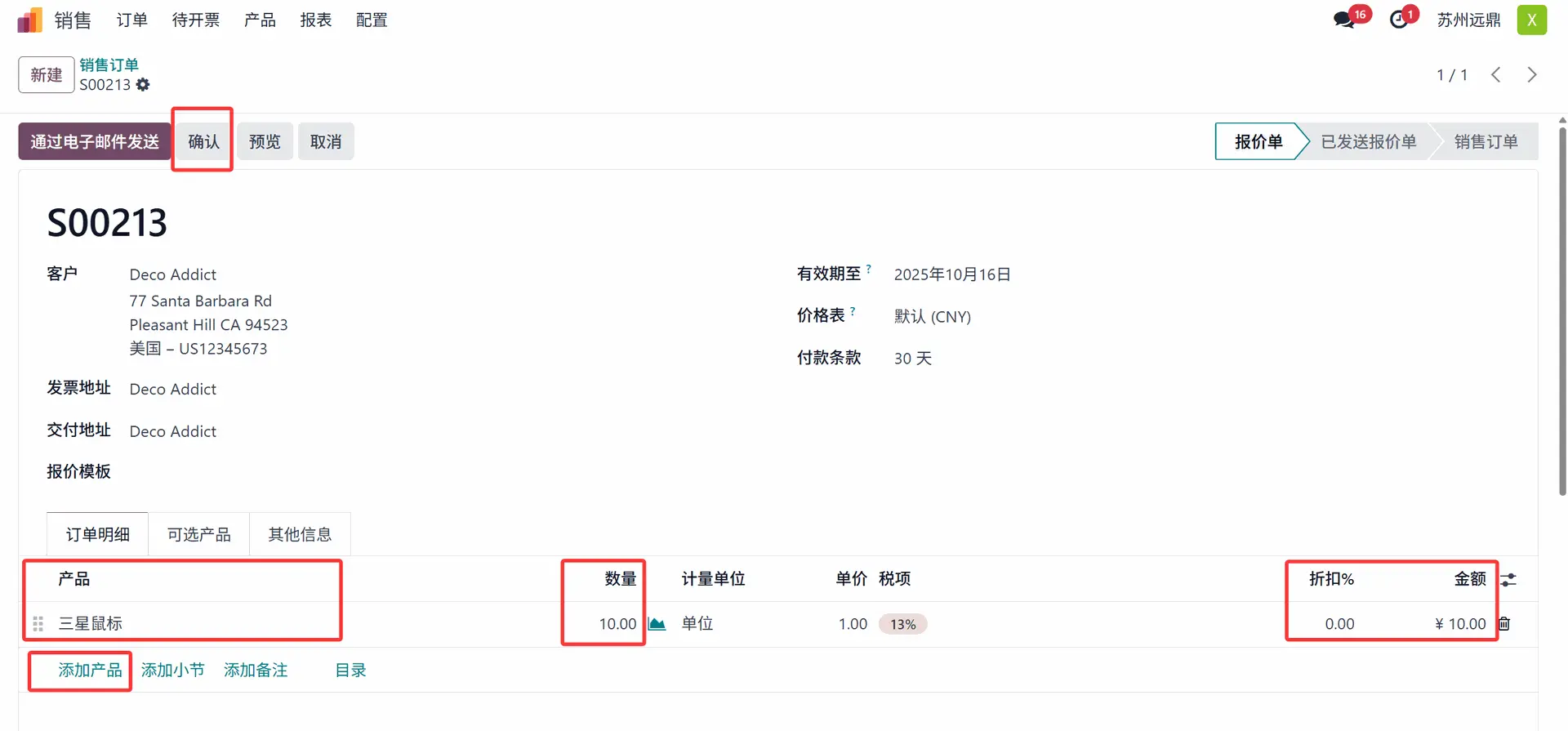 接下来,点击下方的“添加产品”(Add Product) 按钮将物品添加到订单行。填写必要的详细信息,例如数量、折扣等。添加完所有要求的产品后,点击顶部的“确认”(Confirm) 按钮以最终确定并确认订单,如下面的屏幕截图所示。