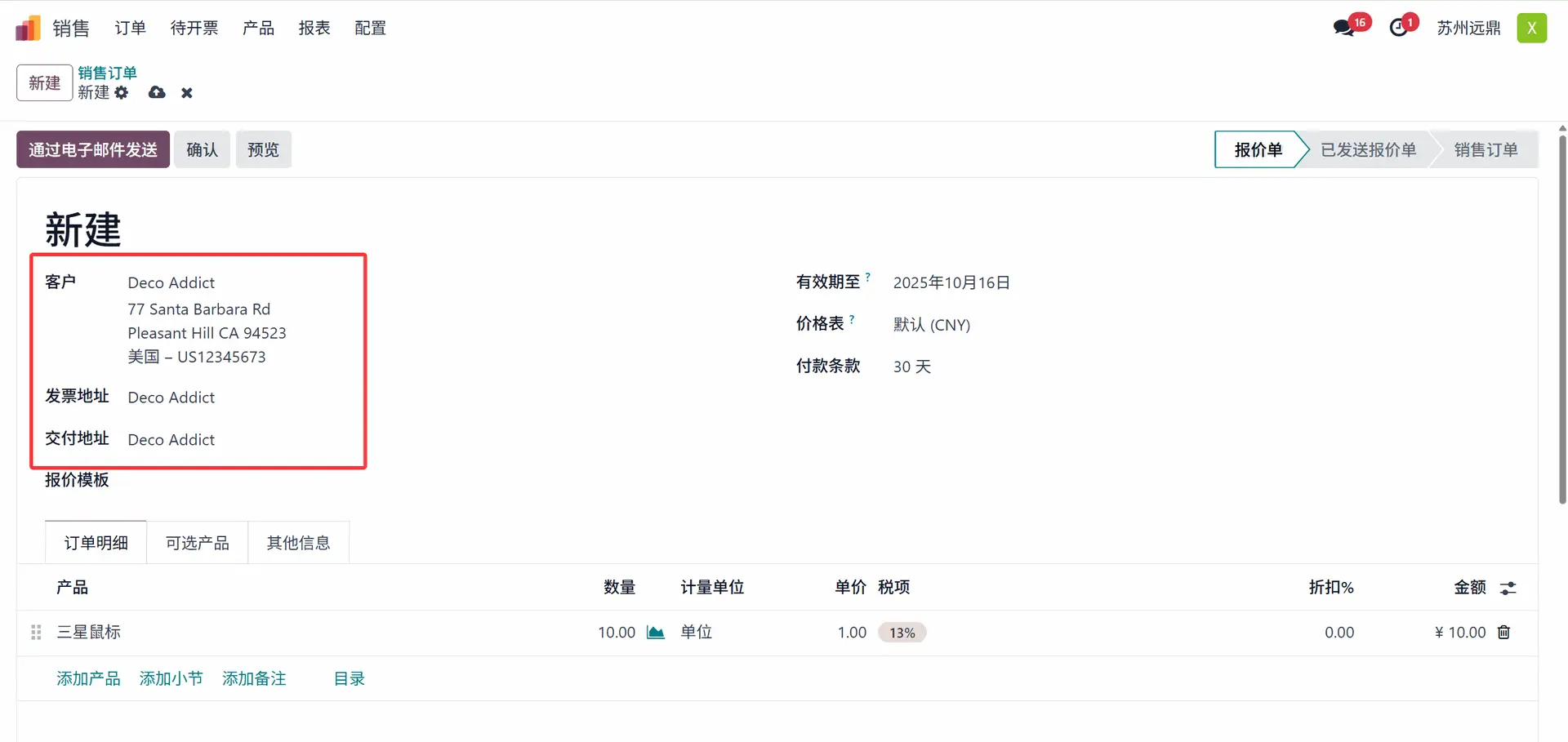 点击“新建”(New) 图标将创建一个新的销售订单。在新打开的窗口中,选择一个客户。一旦选择了客户,系统会自动用该客户的相关详细信息填充“发票地址”和“送货地址”字段,如下面的屏幕截图所示。