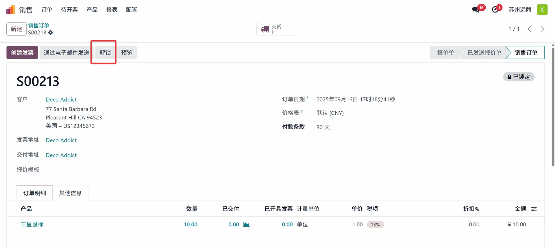 另一个功能是不仅能够锁定销售订单以实施限制,还可以在必要时解锁它。订单顶部有一个“解锁”(Unlock) 按钮,该按钮仅对具有管理员权限的用户可见且可操作。一旦点击“解锁”按钮,订单将变为可编辑状态,允许进行必要的调整。此外,当订单处于解锁状态时,还有一个选项可以再次锁定订单。这些功能如下面的屏幕截图所示。