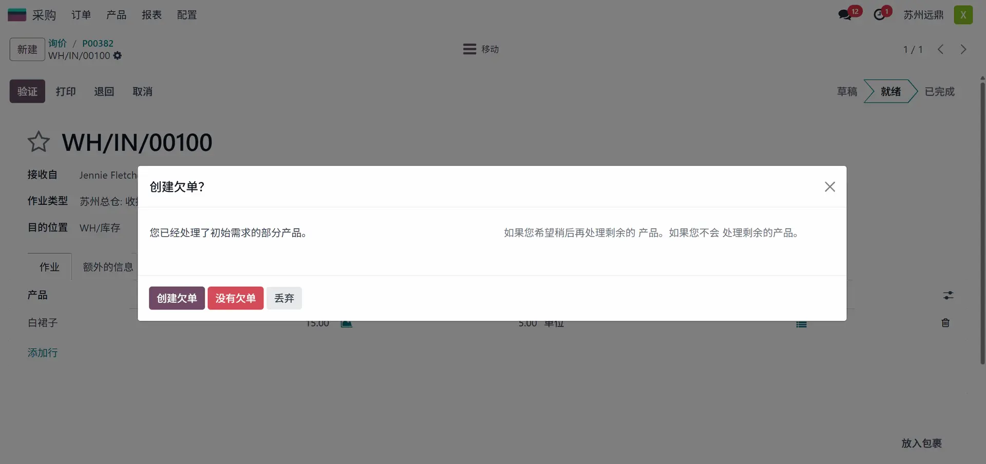 输入一个少于订购量的数量,验证收货,将会出现一个创建欠单的弹窗。选择创建欠单的选项。