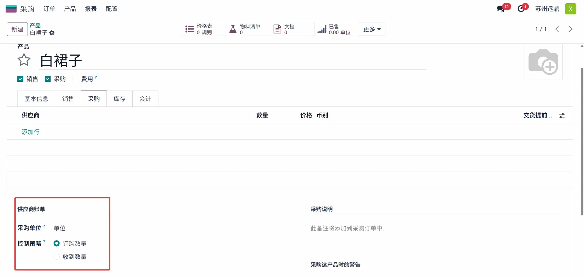 操作方法:导航至 产品 --> 产品,选择一个产品。在产品表单中,点击采购选项卡。在供应商账单部分,修改控制策略字段中的选择。
